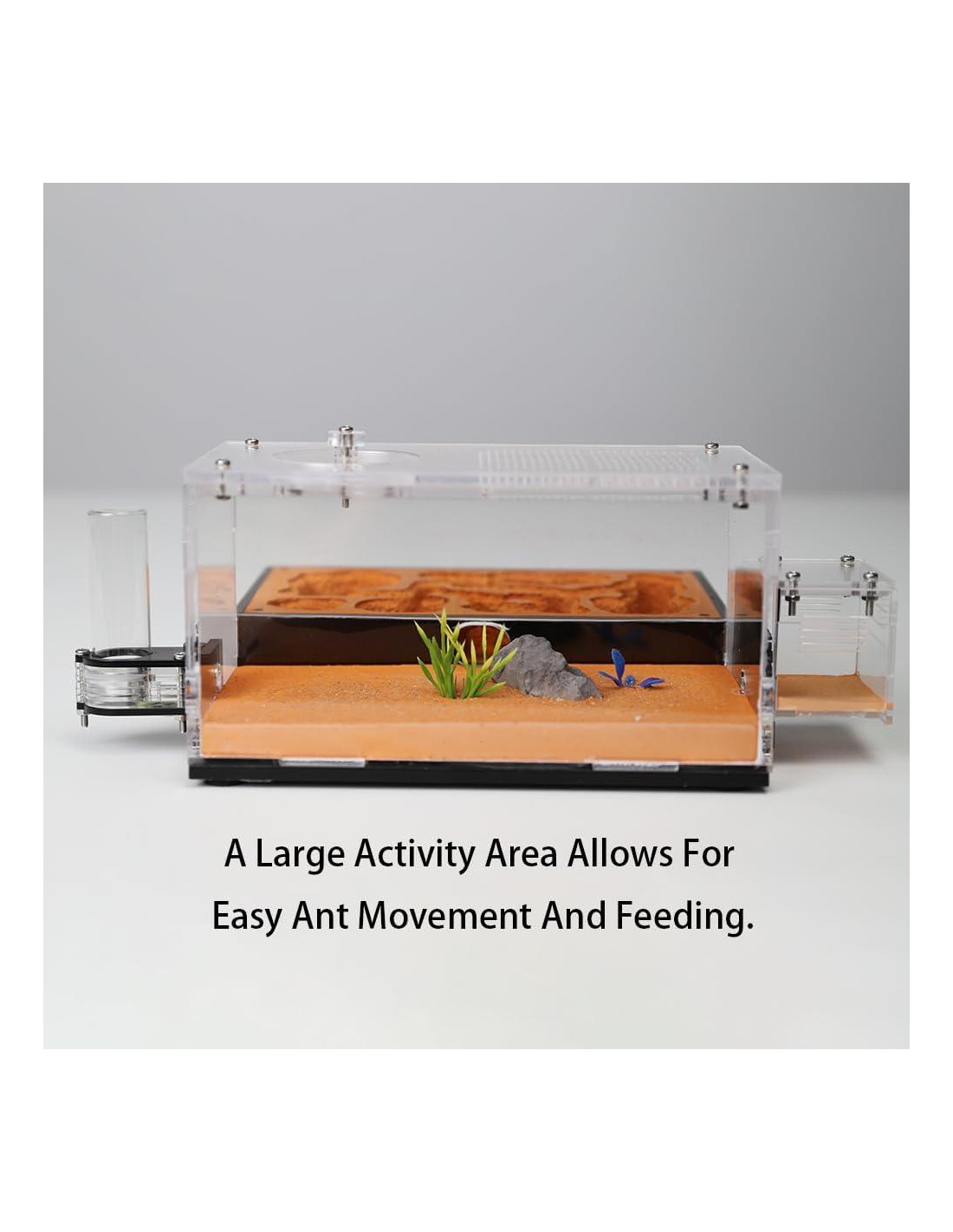 - Tamaño: El nido de hormigas está compuesto por áreas de actividad y áreas de vida. Área de actividad 9.06 inches (23,0 cm) de largo, pulgadas de alto y 4.33 inches (11,0 cm) de ancho. Área de vida 4.5 inches (11,4 cm) de largo, 2 inches (5,08 cm) de alto, 3.5 inches (8,9 cm) de ancho. Las áreas de vida también tienen rocallas y plantas para mejorar el aspecto ornamental