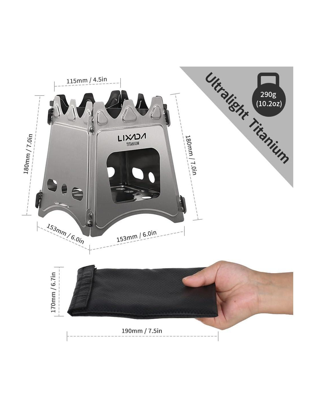 - [Estufa de Madera de Titanio Premium] Lixada se compromete a ofrecerte productos de calidad, la construcción de titanio es lo suficientemente duradera para durar mucho tiempo incluso bajo cargas pesadas o altas temperaturas. El trípode de soporte cruzado proporciona una plataforma estable para tus utensilios de cocina y aumenta el contacto térmico. Con una abertura para añadir madera de manera conveniente. Ventilaciones para buena ventilación y quema eficiente.