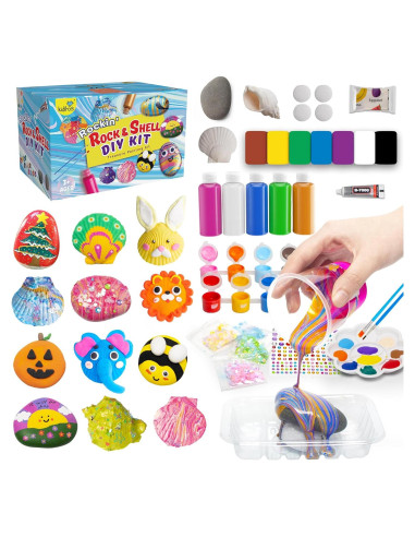 - Kit de Pintura de Rocas y Conchas Rockin': Este set de coloreado de rocas DIY incluye 6 conchas, 2 rocas, 1 caracol, 5 pinturas líquidas, 1 pintura acrílica, 7 arcillas ligeras de colores, 2 guantes desechables, 1 mantel desechable, 4 algodones burbujas, 2 palitos, 1 pegamento, 4 brillos, 4 bandejas de plástico desechables, 4 vasos de plástico, 1 adhesivo de diamante acrílico, un contenedor de almacenamiento y un manual de instrucciones