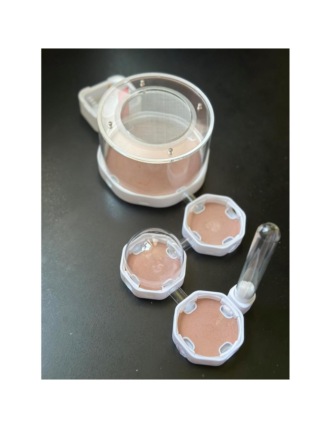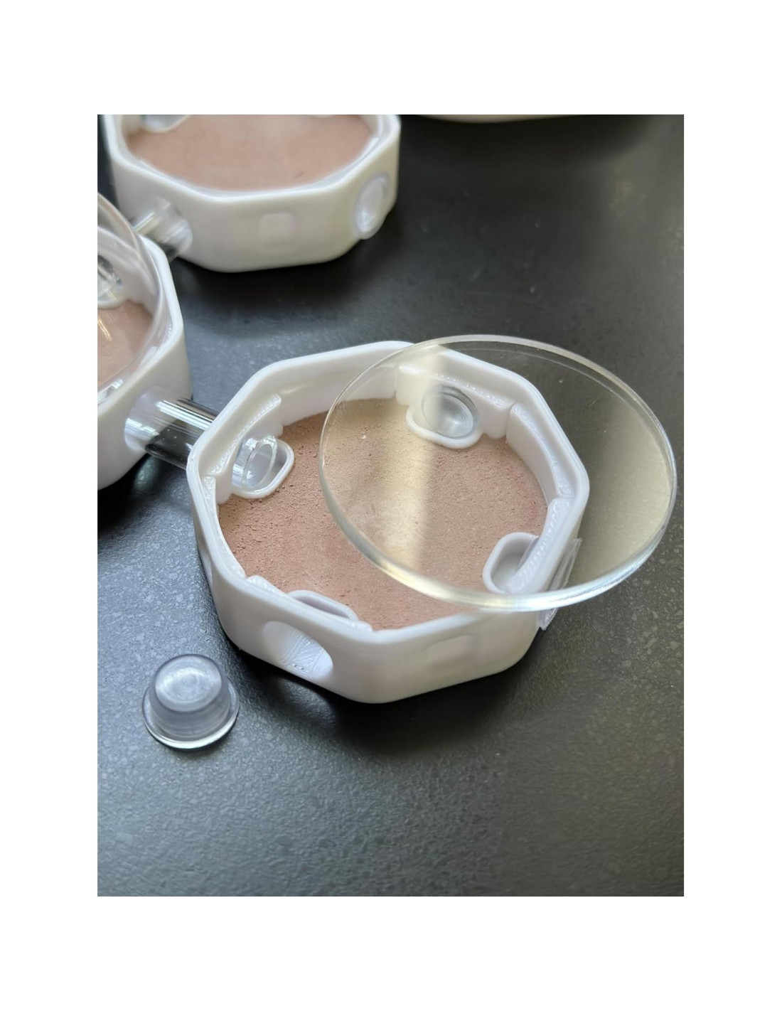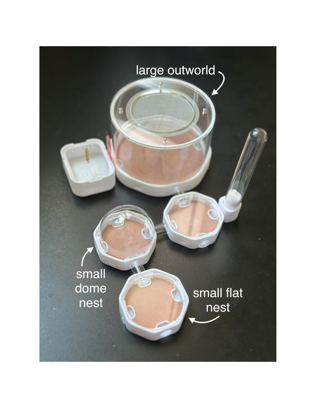 - 1 cápsula grande del mundo exterior - 3 cápsulas pequeñas de nido (2 con tapas planas y 1 con tapa de cúpula) - Tubo de vidrio externo - Caja de alimentación externa - 3 pequeños tubos de conexión de acrílico - 8 tapones Dimensiones: Cápsula grande 10 cm de diámetro y 6 cm de alto 1 cm de ancho agujeros de conexión Cápsulas pequeñas de nido 5 cm de diámetro 1 cm de ancho agujeros de conexión Partes externas como se muestra en la foto del anuncio Tubos de conexión 0.7 cm de diámetro interior USO: - Para aumentar la humedad en las cápsulas de nido, presione un pipete en la esquina para liberar un pequeño chorro corto de agua como se muestra en la foto del anuncio. Si ocurre condensación en la tapa, está absolutamente bien. Simplemente deje la pieza y déjela secar lentamente. Agregue menos agua la próxima vez para evitar demasiada condensación. - Conecte las piezas como prefiera. Al usar por primera vez, los tubos de conexión de acrílico serán difíciles de insertar o sacar de la pieza base y esto es normal. Simplemente use un poco más de fuerza. - Todas las tapas están destinadas a simplemente descansar en la parte superior. El peso de las tapas es suficiente para prevenir escapes. - Mantenga todas las partes fuera de la luz solar directa para evitar el sobrecalentamiento en el interior. * El suelo está equilibrado en pH, yeso no tóxico. Las hormigas pueden excavar parcialmente el yeso cuando quieren más espacio; esto está perfectamente bien. Agregue unas gotas de agua y el yeso se puede volver a colocar. Base impresa en 3D con yeso vertido en el suelo del nido, ayuda a esparcir y crear un buen ambiente húmedo que imita el hábitat natural de las hormigas. Este tipo de yeso se elige sobre otros tipos porque está equilibrado en pH y es no tóxico. Otros tipos de yeso pueden liberar químicos y causar quemaduras en las patas de las hormigas.