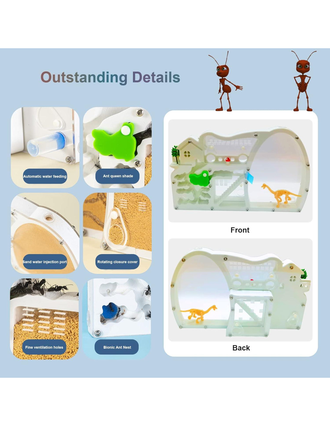 - [Granja de Hormigas Diseñada Científicamente para una Observación Clara del Ecosistema de la Colonia de Hormigas Vivas] Nuestra granja de hormigas utiliza una combinación de nido biónico y nido de arena excavada, diseño de nido húmedo y seco, área de forrajeo doble amplia, área de pila de arena de descarga amplia, sin necesidad de limpiar con frecuencia. El uso de un sistema de auto-bebida, tranquilidad en los viajes y sin preocupaciones. Cerradura para niños, diseño de malla de acero inoxidable anti-escape para prevenir que las hormigas escapen