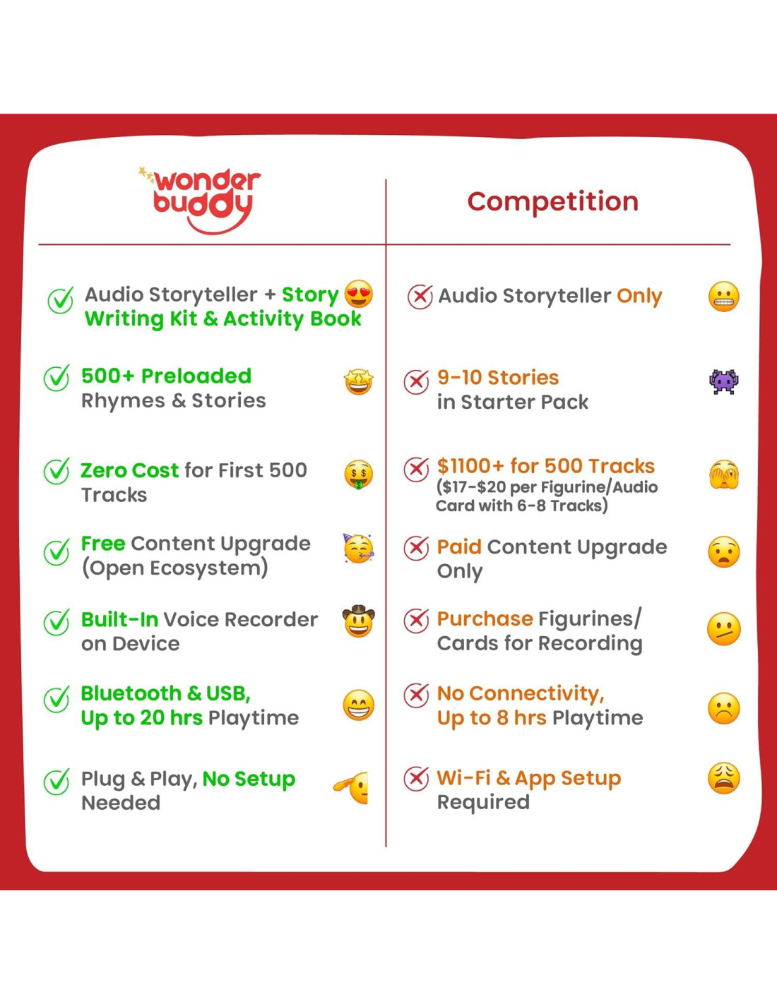 - ¿Por qué elegir tecnología que adormece a sus hijos en un mundo lleno de pantallas? Los narradores de audio WonderBuddy para niños de 3 a 10 años ayudan a reducir la adicción a las pantallas, mejorar las habilidades de escucha y comprensión de un niño, agudizar su capacidad de atención y vocabulario, mientras fomentan el amor por la lectura de una manera divertida y atractiva.