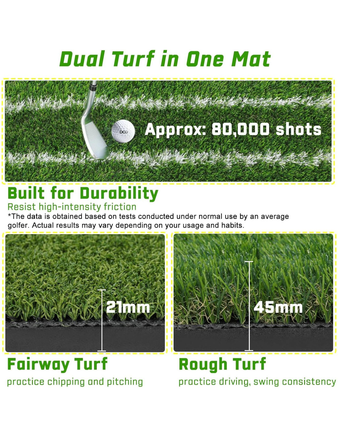 - [Césped de Fairway y Rough Real Feel en Uno] El césped rough es de 45MM, el césped fairway es de 21MM. Practica chipping y pitching en el césped fairway. Practica driving y mecánica de swing en el césped rough.