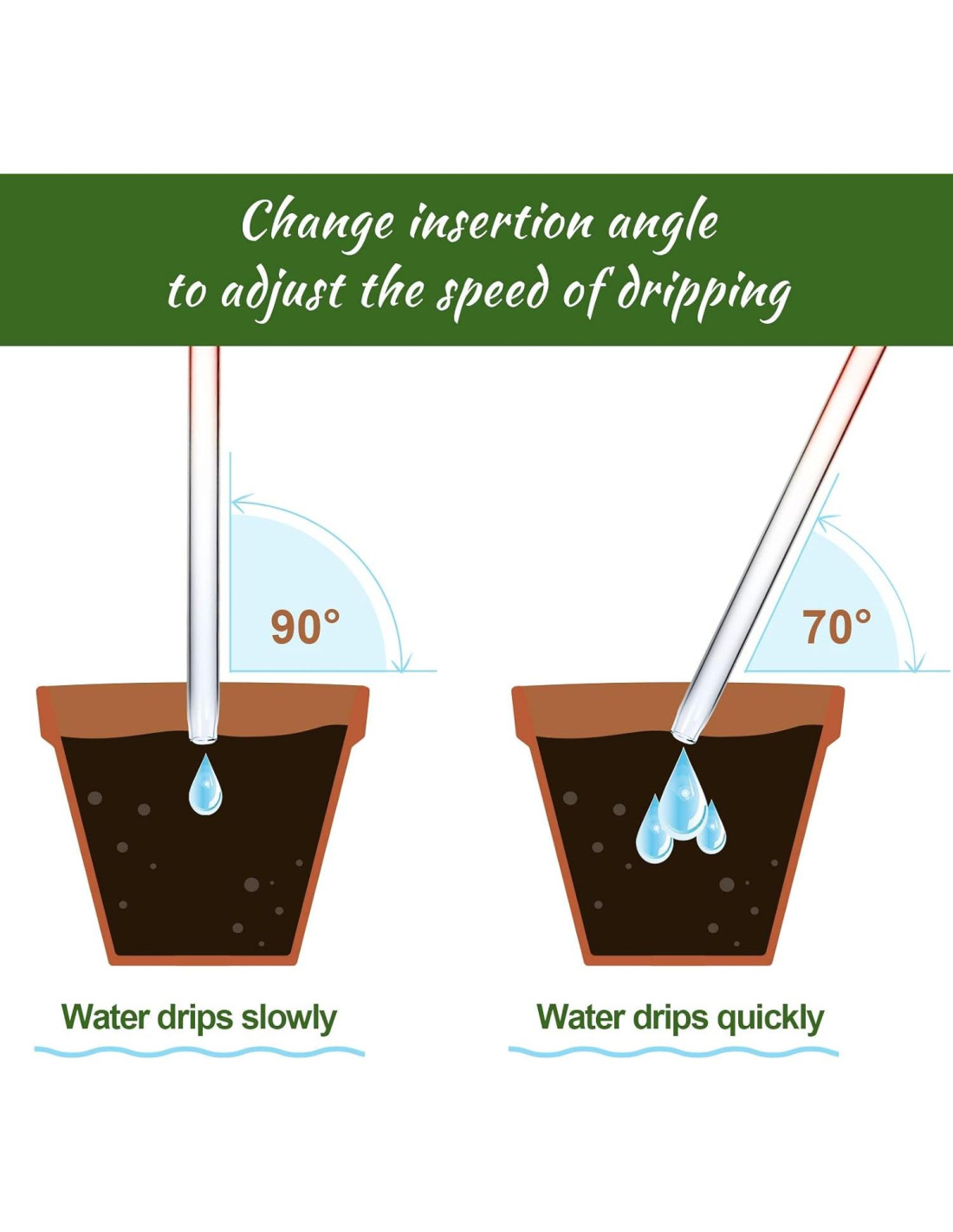 - Mini sistema de riego. La velocidad de drenaje del agua depende de varios factores, incluyendo el tipo de suelo en la maceta, la cantidad de agua que la planta necesita, la temperatura ambiente, etc. Cambia el ángulo de inserción para ajustar la tasa de vaciado y riega la planta a fondo antes de usar el regador para evitar que se vacíe más rápido de lo esperado. Longitud total: 10.2" (25,9 cm), capacidad de almacenamiento del reservorio de agua: 95 mL.
