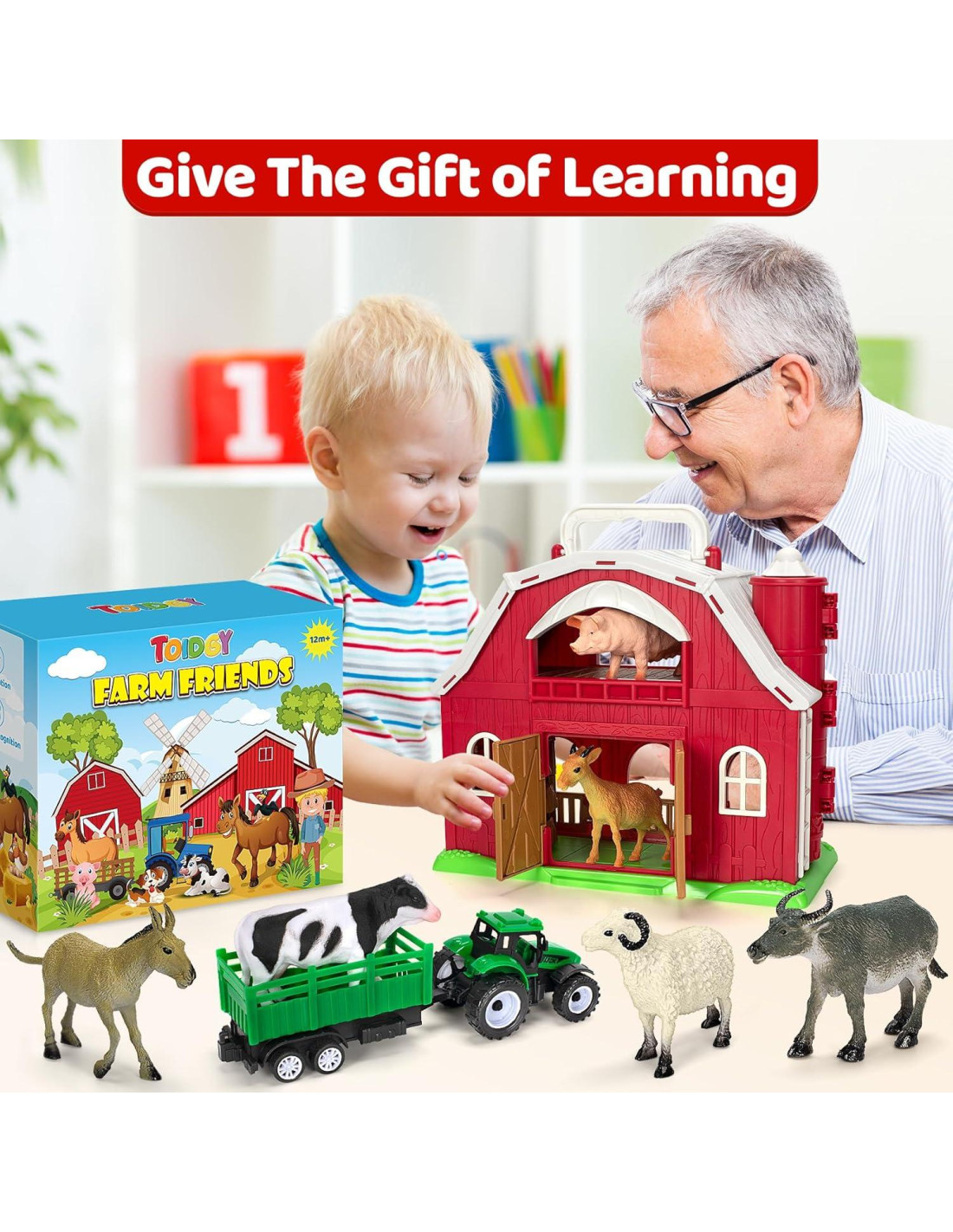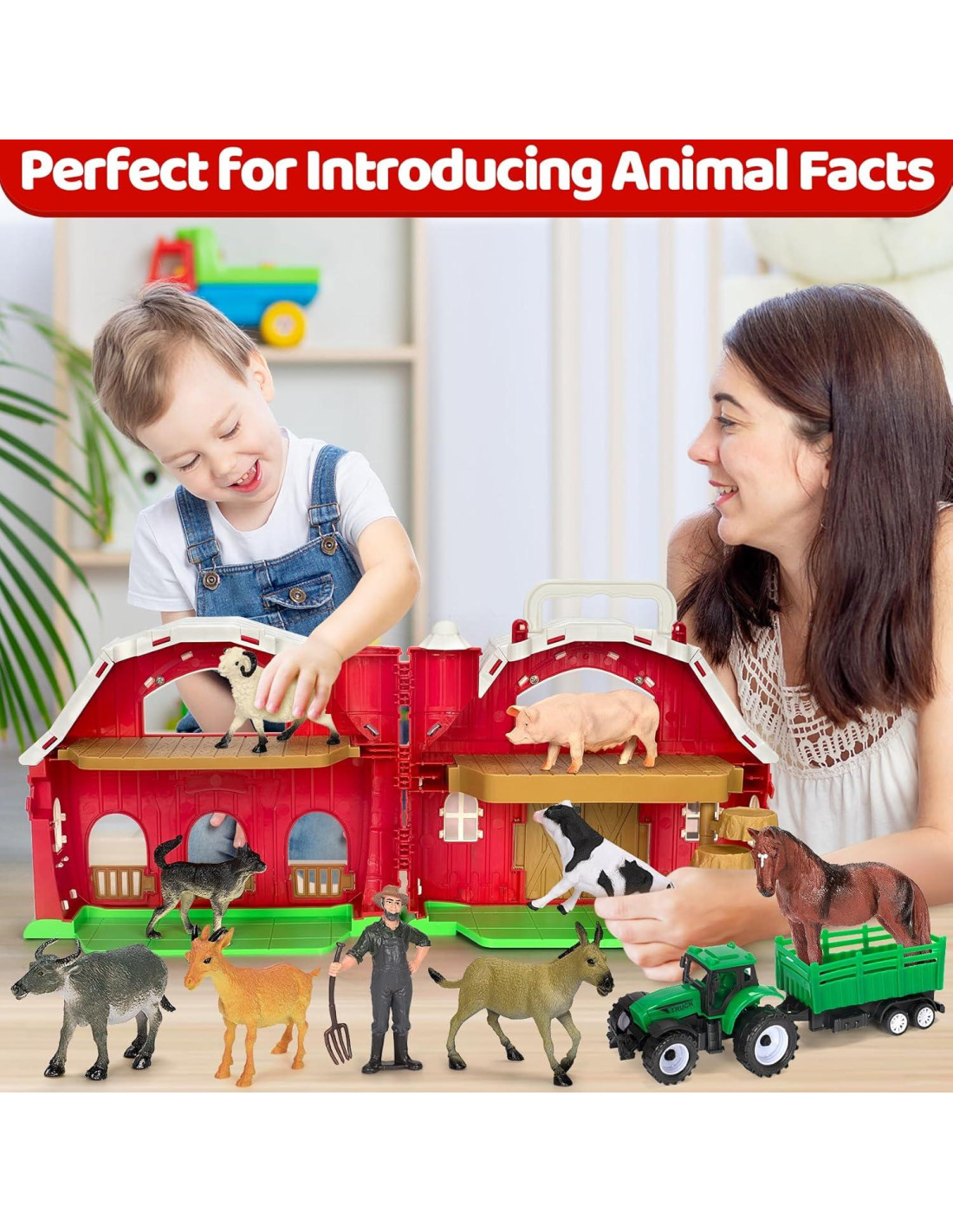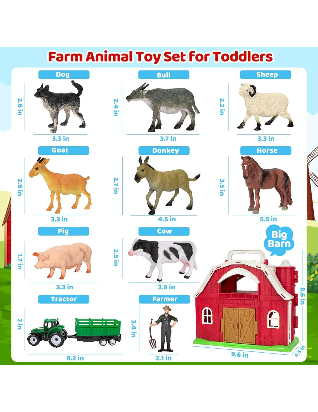 - Divertido Juego de Juguetes de Granja para Niños: El paquete incluye una Gran Granja Roja y 10 figuras de plástico de animales de granja (1 cerdo, 1 vaca, 1 toro, 1 caballo, 1 cabra, 1 perro, 1 oveja, 1 alpaca, 1 tractor verde y un granjero con pala). Estos animales de granja con diseños realistas y adorables son perfectos para el juego sin pantallas e introducir a los niños en edad preescolar de 1 a 5 años a las figuras de animales. Juguetes para niños de 1 a 3 años.