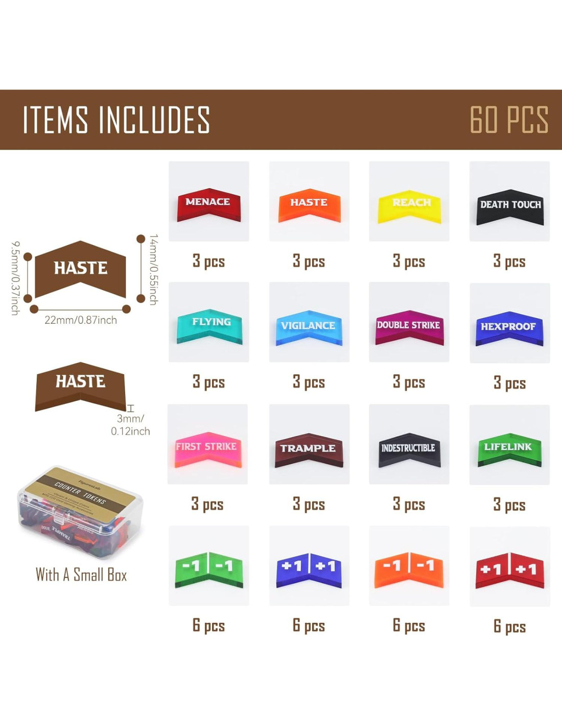- EL CONJUNTO DE CONTADORES MTG INCLUYE - 3x Golpe Primero, 3x Doble Golpe, 3x Indestructible, 3x Hexproof, 3x Prisa, 3x Alcance, 3x Vínculo Vital, 3x Toque Mortal, 3x Amenaza, 3x Atropellar, 3x Volar, 3x Vigilancia, 12x +1/+1, 12x -1/-1. Cada contador MTG está impreso en un color único de acrílico transparente fabuloso, lo que facilita la identificación y gestión de las mecánicas del juego de un vistazo.