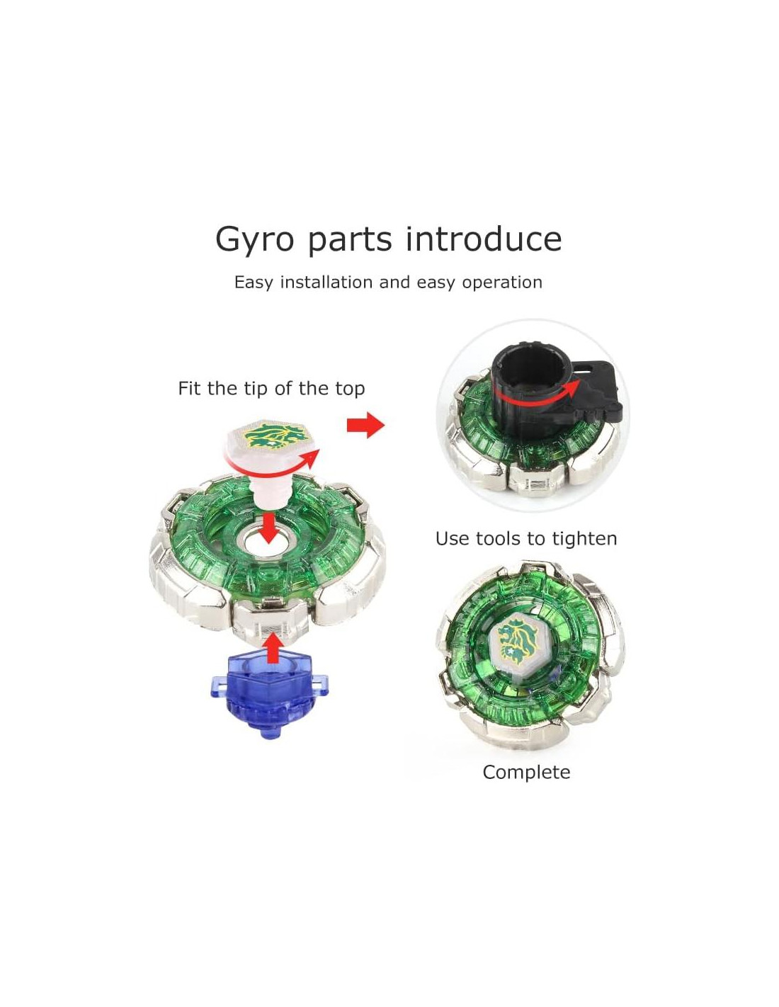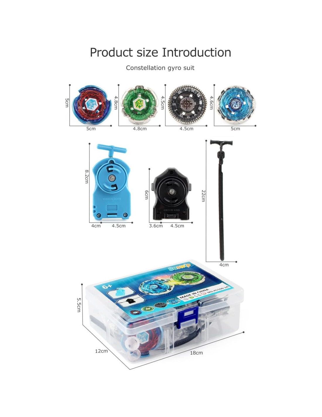 - Empacado en caja de almacenamiento. Incluye: 4x tops giratorios; 4x stickers; 2x lanzadores de poder con 1x cuerda; 1x instrucción