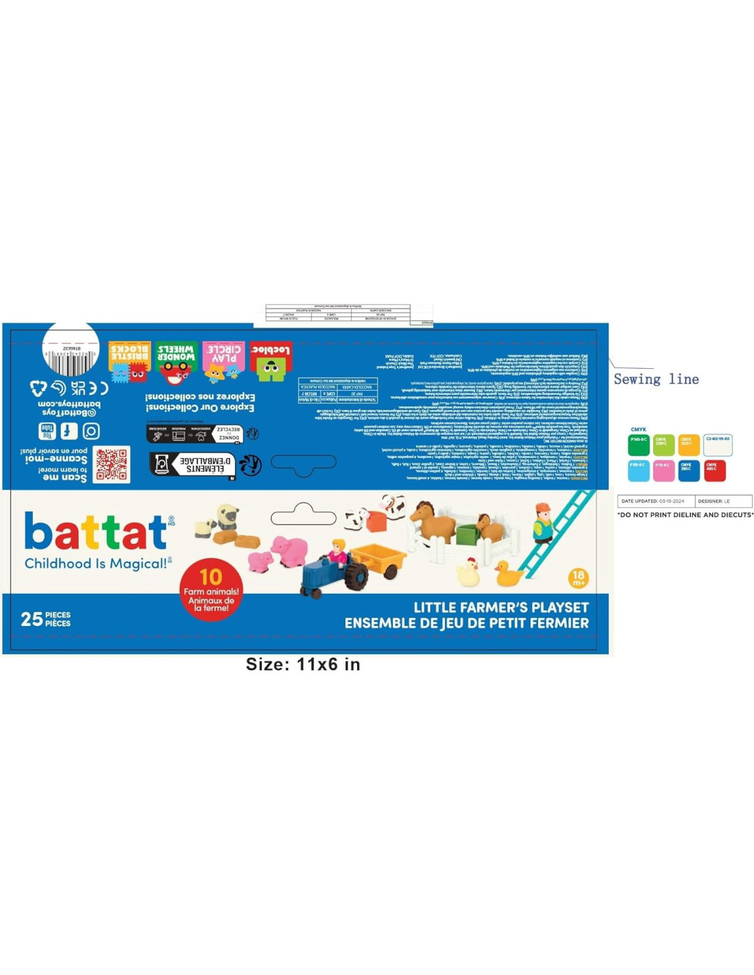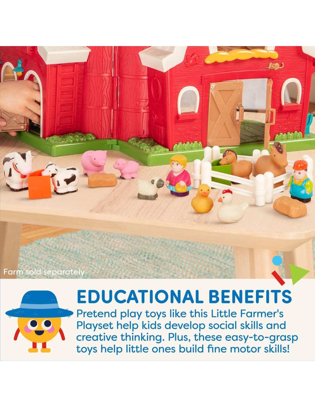 ¡Viaja desde la sala de juegos hasta el corral con el Juego de Granjero Pequeño de Battat! Este juego de juguetes clásico viene con 25 accesorios de granja para que tu niño explore y juegue: un tractor y remolque, escalera, granjeros, cercas, montones de heno, comederos y 6 tipos de animales de granja. Conoce a un cerdo y un lechón, una vaca y un ternero, un caballo y un potro, una oveja y un cordero, un pollo y un pato, todos ellos son adorables, coloridos y amigables para manos pequeñas. Estos juguetes de granja son excelentes para emparejar, contar, aprender y un montón de juego de simulación. Hechos de materiales duraderos y sin preocupaciones, todos los productos de Battat cumplen o superan los estándares de seguridad de la UE, EE. UU. y Canadá. Recomendado para pequeños granjeros de 18 meses en adelante.