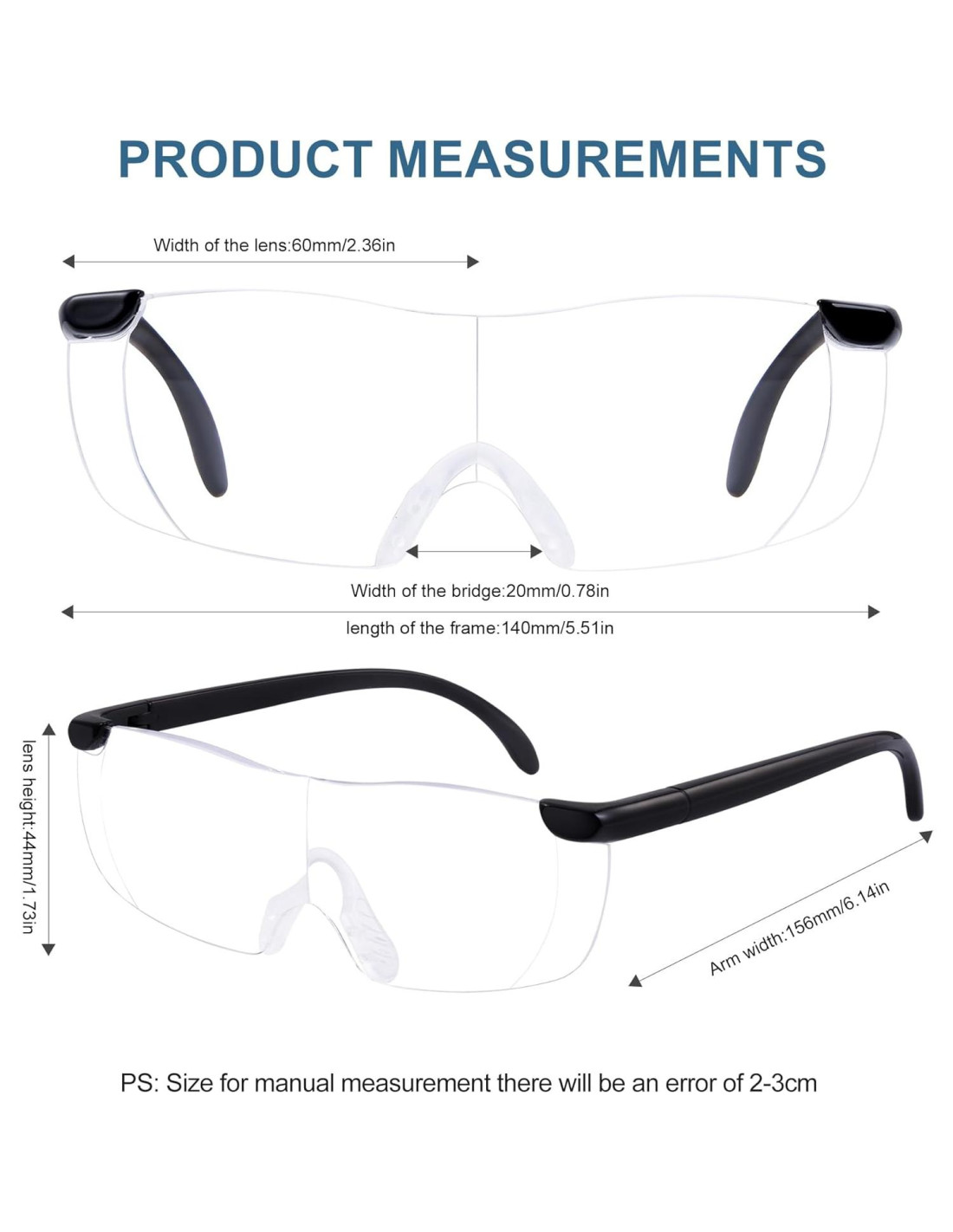 Las gafas de aumento OUSHIUN están diseñadas para trabajos de tareas de cerca como lectura, costura y manualidades. Estas gafas se ajustan perfectamente sobre tus gafas recetadas, ofreciendo un aumento del 200% para ayudarte a ver los detalles finos con facilidad. Ya sea que estés leyendo texto pequeño, trabajando en un proyecto de costura o disfrutando de tus manualidades favoritas, estas gafas mejoran la precisión y la comodidad. Ideales para cualquier persona que necesite un aumento adicional para tareas detalladas.