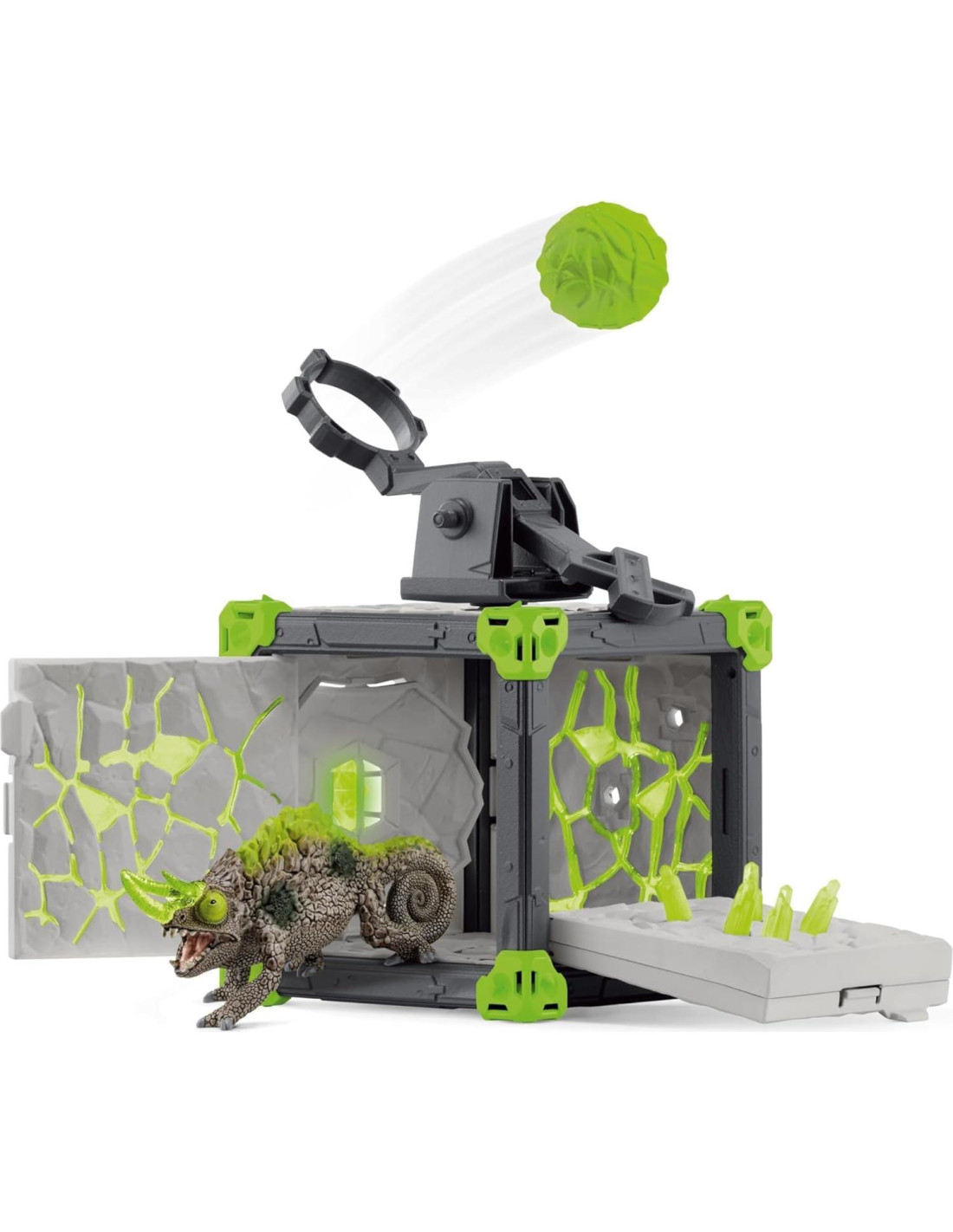 El Camaleón de Piedra ha expandido su BatallaCueva en una verdadera fortaleza para proteger el Cristal del Mundo en su interior de los ladrones. Con sus ojos sobredimensionados, puede ver desde lejos cuando los atacantes se acercan. ¡Es hora de poner en posición la catapulta en el techo y cargar la munición! ¡Mejor cúbrete del gran orbe que viene hacia ti! El Camaleón es un buen tirador y también puede acoplar la catapulta al lado de la BatallaCueva si es necesario. Las BatallaCueva ELDRADOR CREATURES transforman cada habitación infantil en una zona de acción. ¿Quién se enfrentará a la impresionante batalla? Todas las BatallaCueva se pueden combinar. Túneles aterradores y trampas engañosas esperan a los atacantes. En la gran arena pueden encontrarse para el duelo final. ¡Qué pelea!