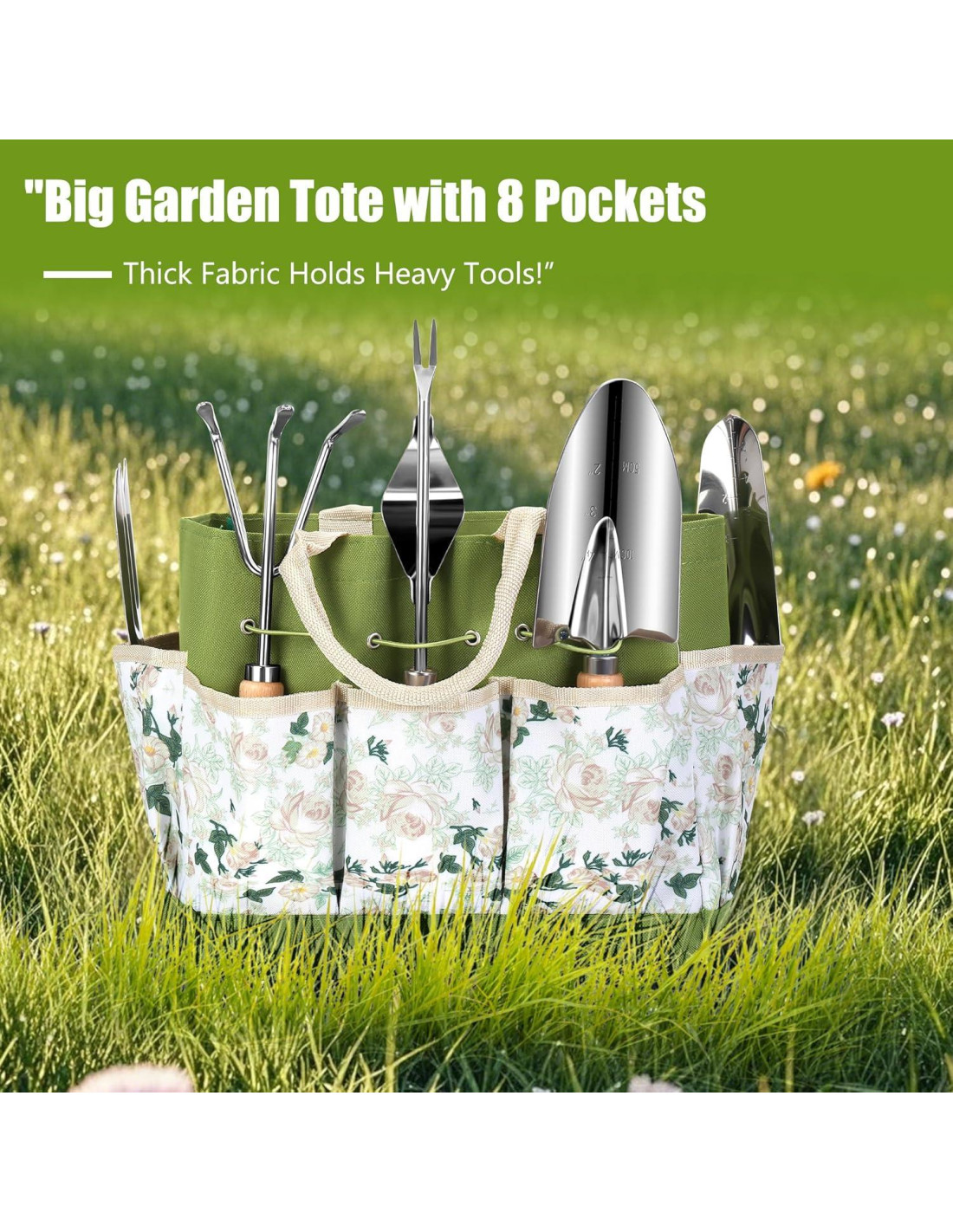 - Juego de Herramientas de Jardinería DIGOAKO - Incluye tijeras de podar, desherbadora, trasplantador, cultivador y 4 herramientas esenciales, además de una bolsa de mano con estampado floral y tarjeta de felicitación. Un kit de jardinería completo con herramientas esenciales para el cuidado diario de las plantas.