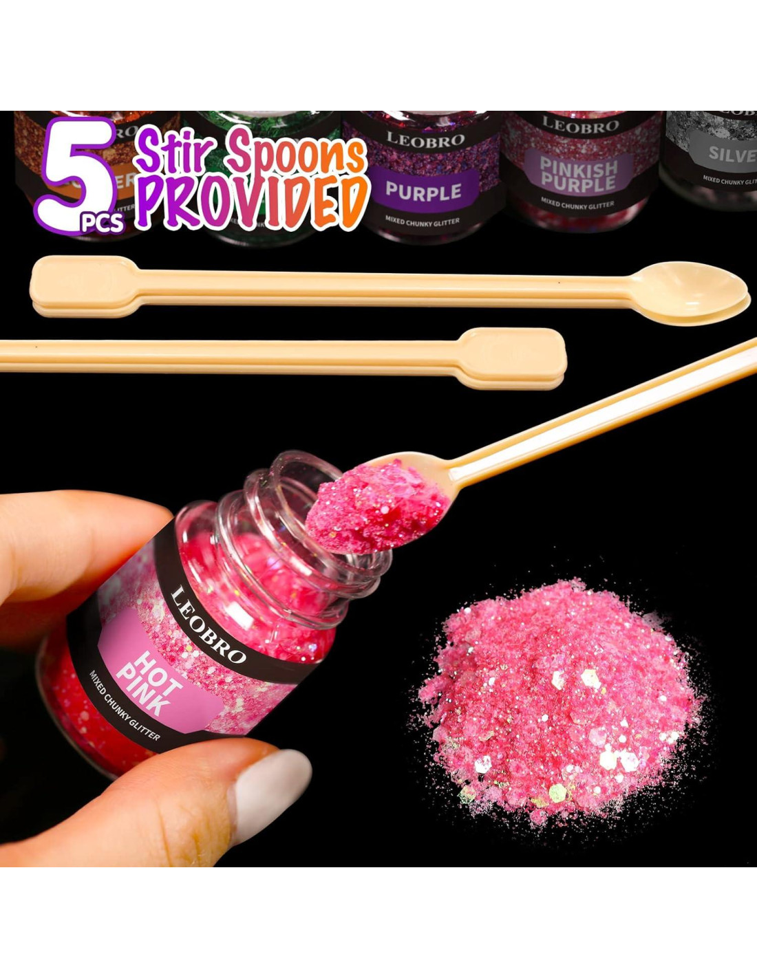 - 5 PCS Cucharas de Mezcla Proporcionadas: Incluye 5 cucharas largas de plástico, ayuda a sacar la purpurina de resina, controlar la cantidad adecuadamente y mezclar la purpurina con otros materiales de manualidades como resina, jabón, esmalte de uñas, etc., para crear un efecto impresionante.