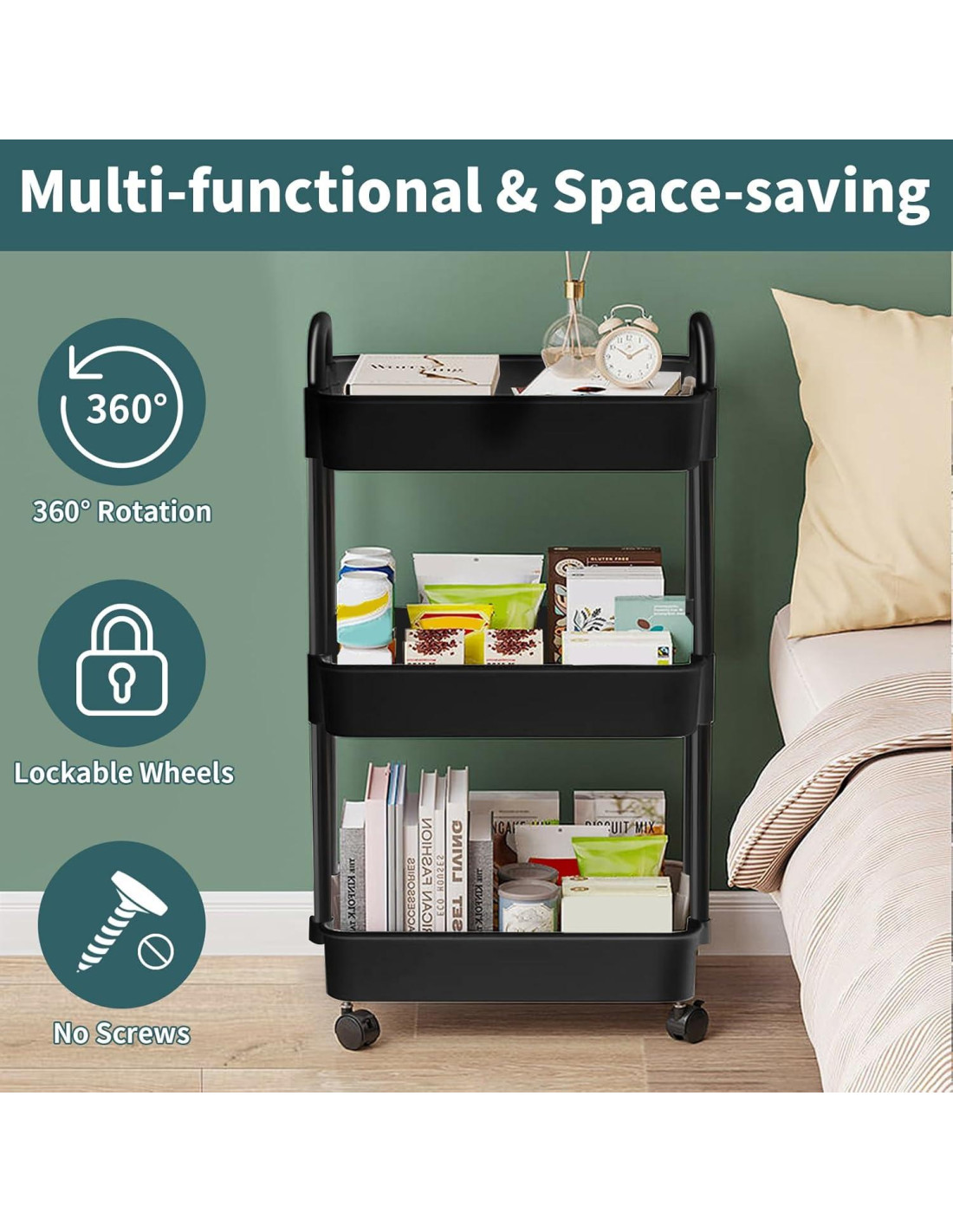 - Almacenamiento multifuncional. Este carro rodante de tres niveles se puede colocar en la cocina, sala de estar, baño, estudio y otros lugares. Puedes usarlo para colocar artículos de uso diario, pañuelos, revistas, bocadillos o artículos de tocador, libros y otros artículos. Mejora la limpieza de tu hogar.