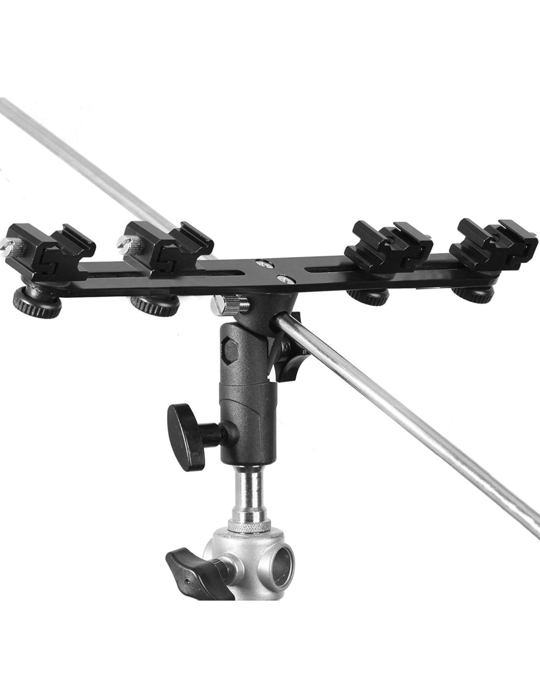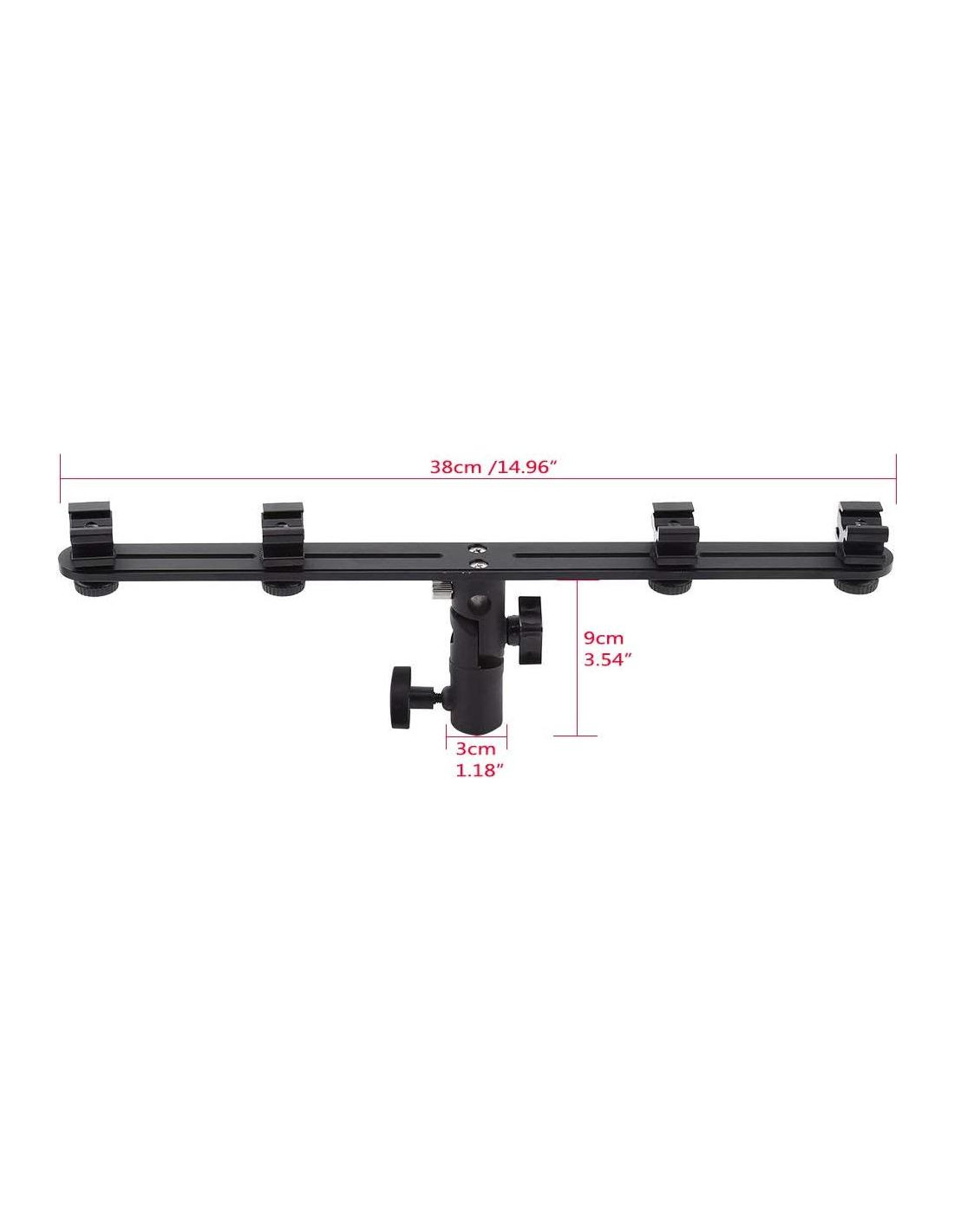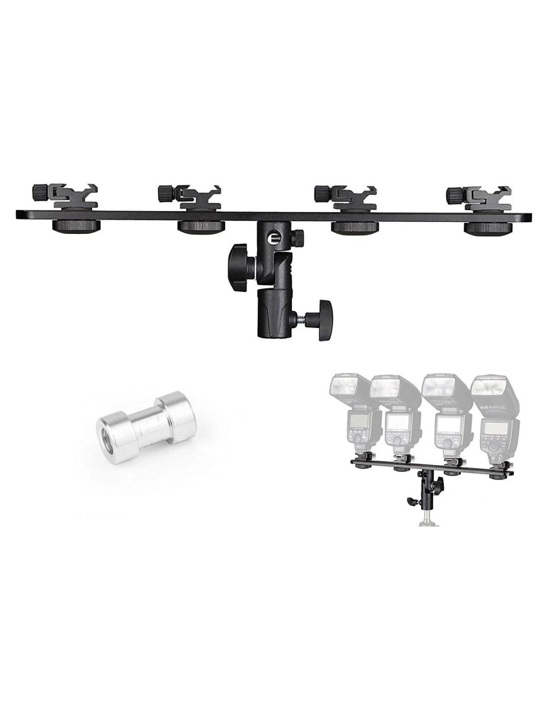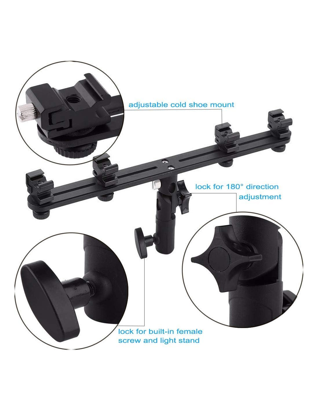 - [DISEÑO DE CUATRO ZAPATAS FRÍAS] Puedes adjuntar cuatro unidades de flash en este soporte de flash E4, el clip de zapata caliente especial se adapta a la mayoría de los flashes de cámara o luces LED de video. Además, puedes montar micrófonos externos, cámaras pequeñas y otros dispositivos destinados a ayudarte a capturar mejores imágenes. Por ejemplo, puedes usarlo para montar múltiples receptores inalámbricos para audio cuando necesites configurar varios micrófonos inalámbricos en el negocio de videografía.