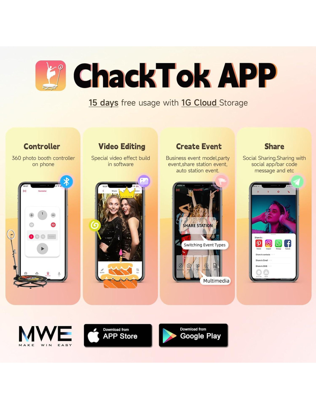 - [Software de Grabación Profesional: CHACKTOK] Software profesional CHACKTOK, soporte para video de pirueta/video en cámara lenta/detección de cara en cámara lenta/modo espejo inteligente. Un clic para generar foto/video/GIF emoticonos, agregar subtítulos, filtros, características de belleza y salida de calidad de imagen. Control remoto de la rotación de la cabina fotográfica 360 y creación personalizada de actividades de grabación.