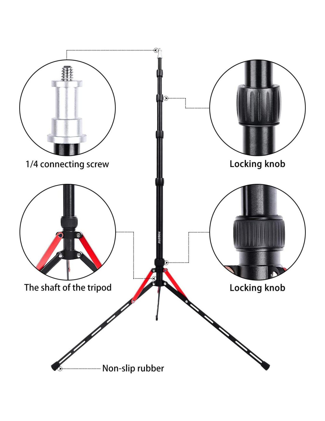 Este soporte de luz de fotografía de 222cm de aleación de aluminio es ideal para anillos de luz, sostener reflectores, softboxes, luces LED, luces de flash y paraguas. Han sido muy útiles para la luz de fotografía y para montar y desmontar más fácilmente. Ideal para trabajo en locación. Este soporte es increíble cuando necesitas moverte. Puedes ajustar la altura a tu opción. Portátil, ligero y lo suficientemente compacto para viajar con una bolsa de soporte. Facilita el transporte y almacenamiento del producto. Altura plegada: 48.5cm. Altura máxima: 222cm. Altura mínima: 48.5cm. Capacidad de carga máxima: 3kg. Peso neto: 0.6kg. Color: Negro+Rojo. Punta de tornillo de 1/4 en el vástago, soporta la mayoría del equipo fotográfico como anillo de luz, soporte para teléfono inteligente, reflector, softbox, diferentes luces, paraguas, etc. 1 x Soporte de Luz 1 x Bolsa de Transporte. Por favor nota: Solo soporte, luz y otros accesorios no incluidos.