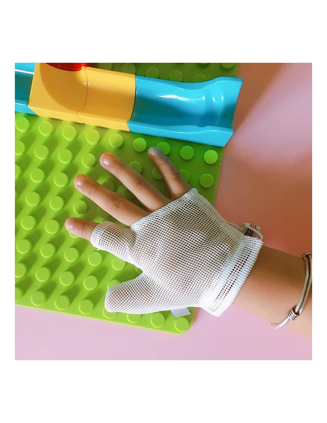- Este producto es un gran dispositivo para que un niño lo use en su mano como un recordatorio para no chupar.