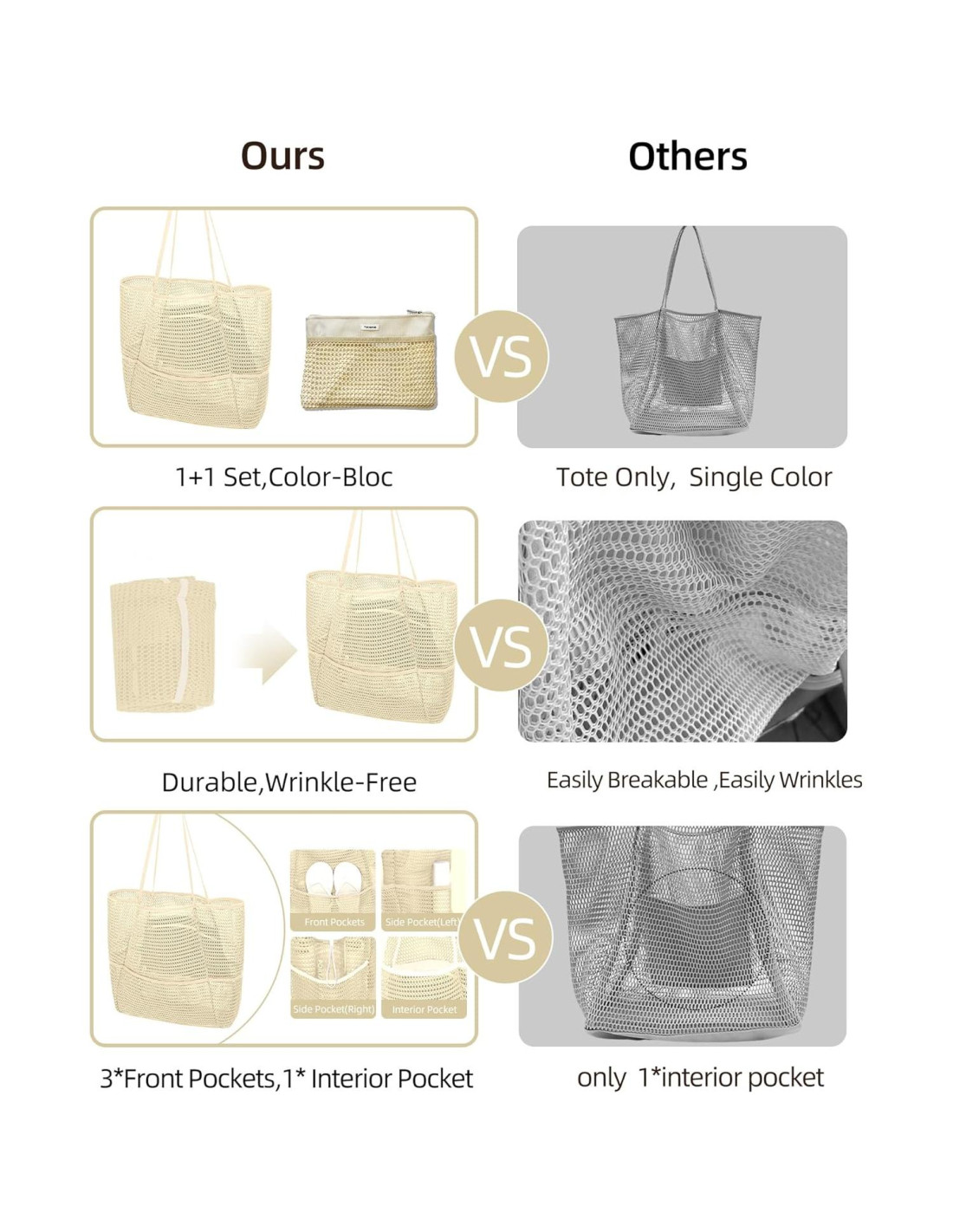- 1. [2-en-1 Bolsa de Playa Plegable - Se pliega en un Estuche Compacto] Esta gran bolsa de playa se pliega fácilmente en el estuche de maquillaje incluido, haciéndola ligera y amigable para viajar. ¡Perfecta para ahorrar espacio en tu maleta o coche!