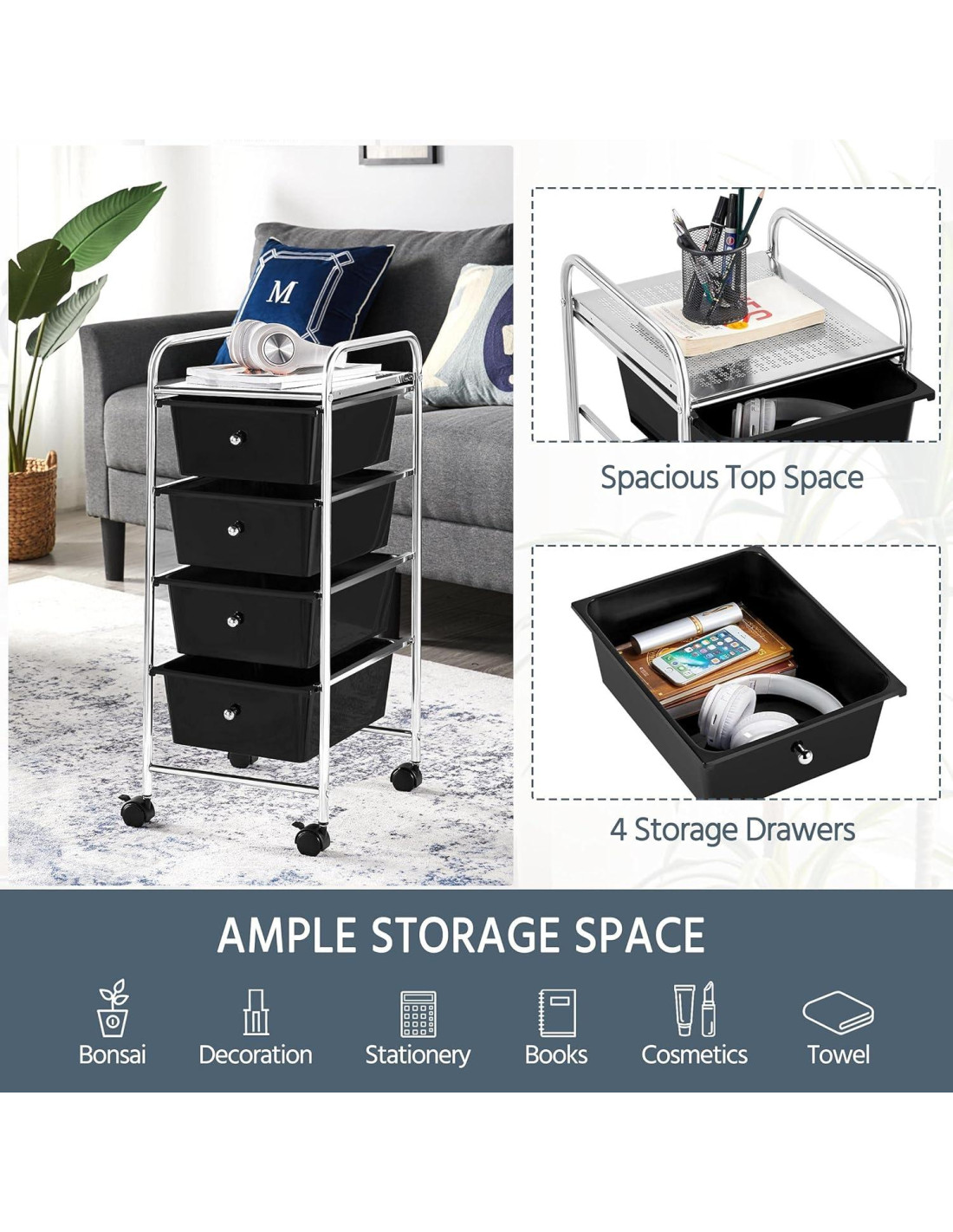 - Uso Ilimitado: Con cuatro cajones de 4.5" D (11.43 cm), ruedas bloqueables y un aspecto minimalista, este carro de almacenamiento puede servir en su oficina, estudio, sala de estar, baño o vestidor para organizar archivos, objetos diversos, suministros de lavado, aplicadores de cosméticos, herramientas de pintura, suministros de arte, etc.