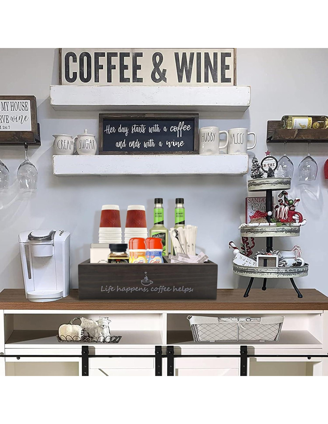 - ACCESORIOS DE BAR DE CAFÉ. Más que un organizador de estación de café eficiente, esta también es una caja decorativa para la mesa de bar de café con una frase inspiradora "La vida sucede, el café ayuda" y un logo de taza de café. Podría ser tanto un organizador de bar de café como una decoración de bar de café. Se adapta muy bien a cualquier rincón de café en la despensa de la oficina, vestíbulo de hotel, mesa de buffet, sala de espera...