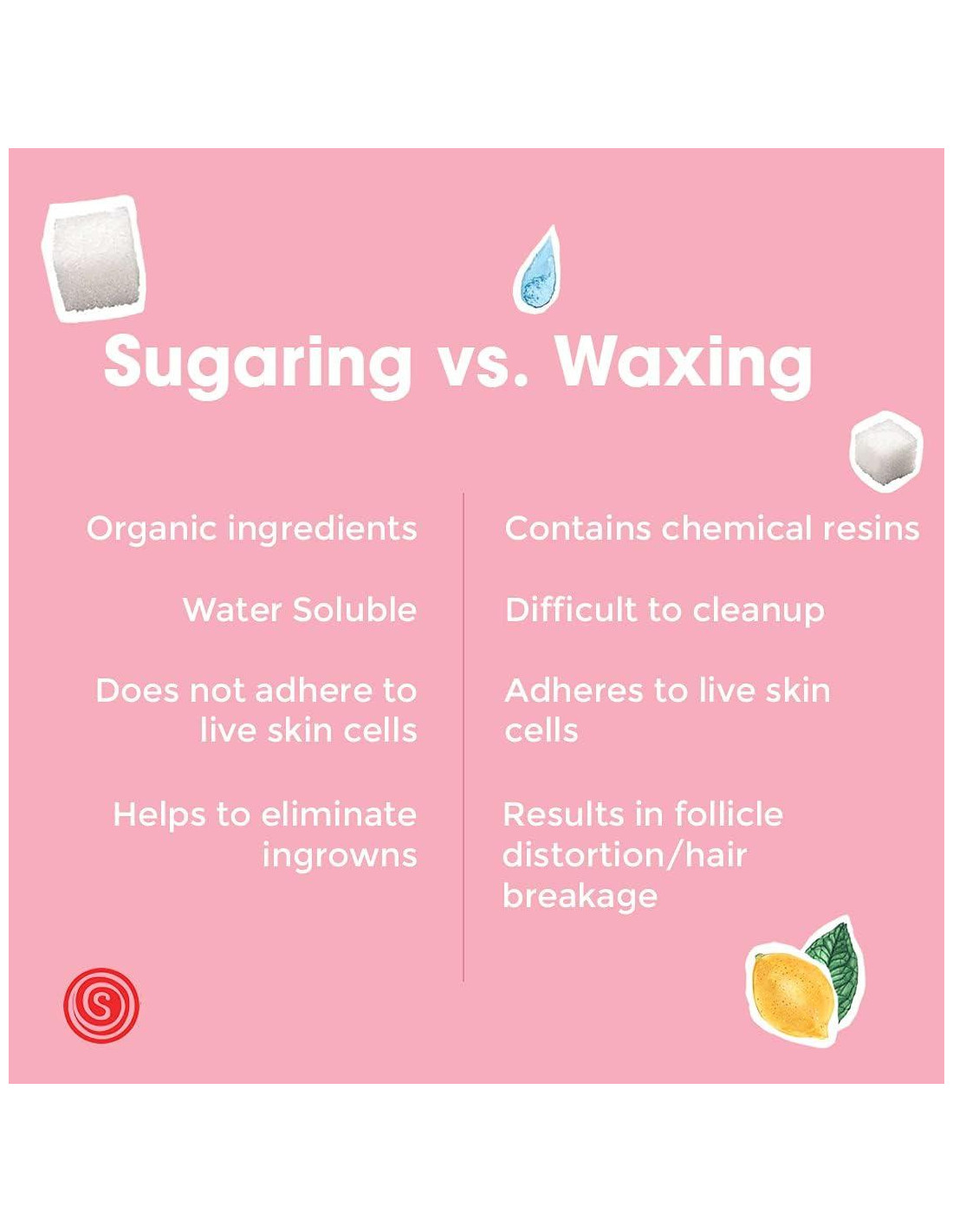 La pasta de azúcar utiliza solo ingredientes naturales. La preparación es 100% natural, conteniendo solo agua y azúcar, sin químicos, fragancias ni colorantes. Es hipoalergénica, no causando irritación en la piel. ¡Es tan natural que una persona con gusto por lo dulce incluso puede comerla! La cera está hecha de resinas y a menudo de químicos tóxicos también. Estos ingredientes son a menudo irritantes, si no tóxicos, para la piel.