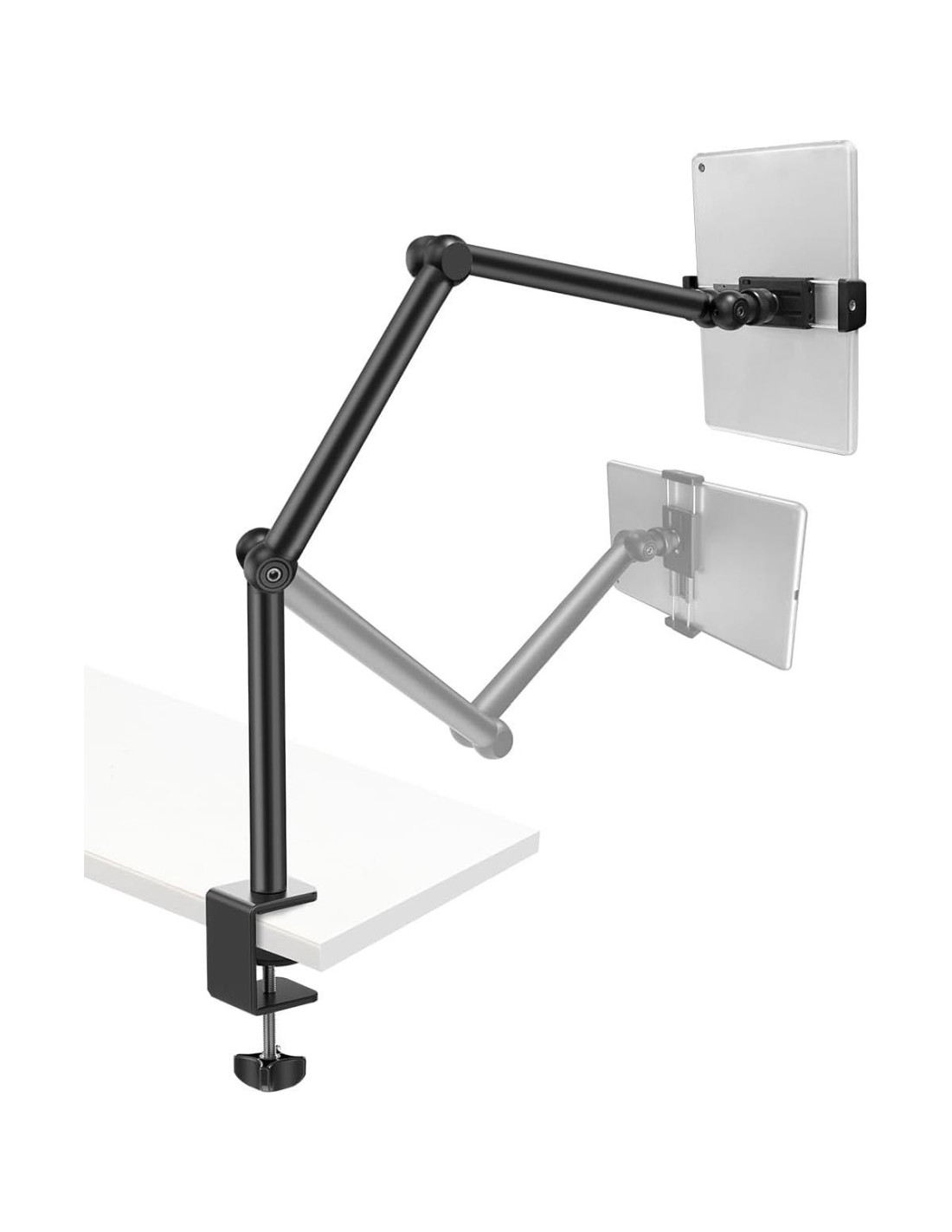 - Brazo de Boom Totalmente Ajustable: Con un rango de ajuste vertical de 340 y una rotación horizontal de 360, tienes la libertad de posicionar tu teléfono, iPad o micrófono con precisión sin tener que aflojar las perillas