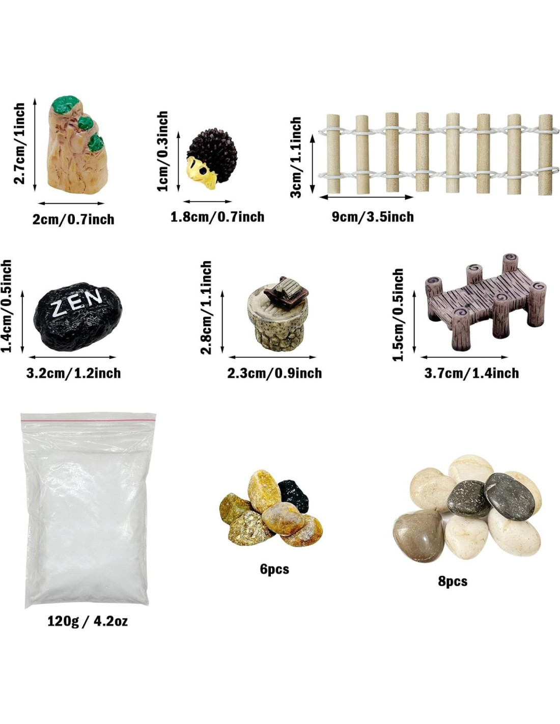 - Kit de Jardín Zen Mini: El conjunto incluye 22 piezas de miniaturas de jardín y 1 bandeja de bambú de 21.5 x 17.5 x 1.3 cm (8.4 x 6.8 x 0.5 pulgadas). ¡Usa este mini jardín zen de arena de mesa! Te deseamos que disfrutes de tu tiempo en el jardín.