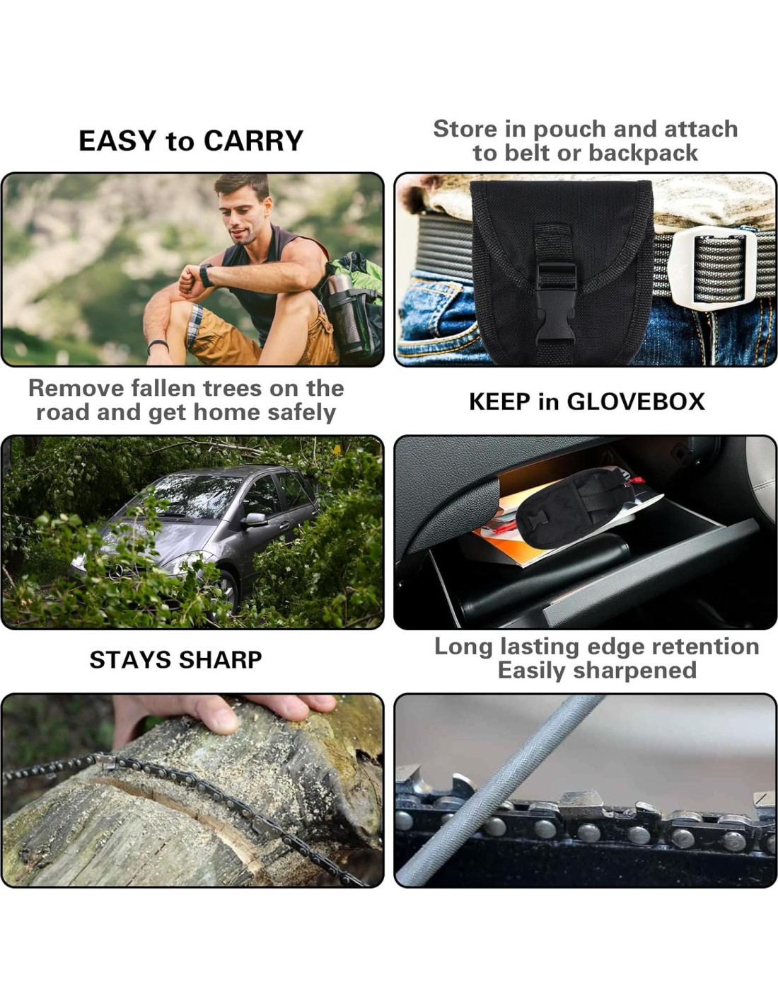 - Afilada y rápida. Esta sierra de cadena manual portátil mide aproximadamente 24 pulgadas (61 cm) de largo y la sierra de cuerda de bolsillo está equipada con 11 dientes de corte afilados. El equipo de bushcraft puede cortar madera en segundos.