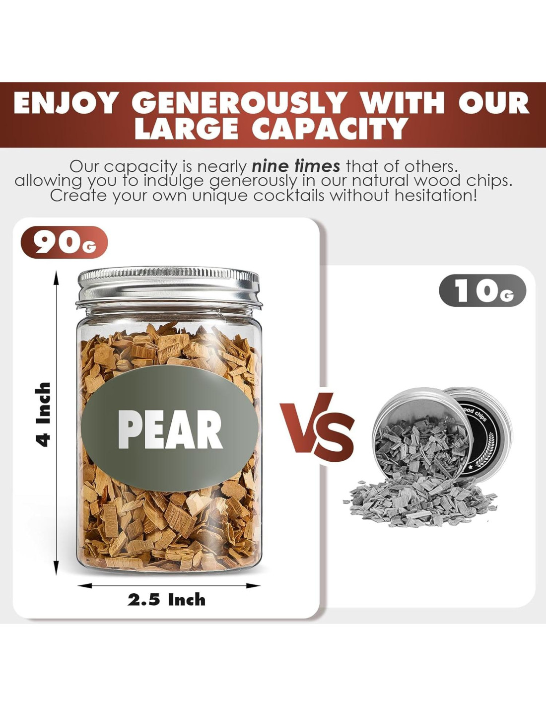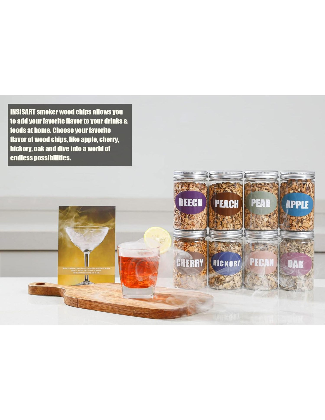- VARIEDAD DE 8 SABORES DE AHUMADO PREMIUM - Más astillas, más sabor. El conjunto de astillas para ahumar incluye manzana, cereza, roble, pacana, pera, durazno, nogal, astillas de haya. Un conjunto de astillas te ayudará a probar diferentes tipos de madera para ahumar y podrás determinar qué tipo de astillas te gustan más. Incluye un manual de instrucciones para hacer cócteles ahumados, perfecto para principiantes en ahumado