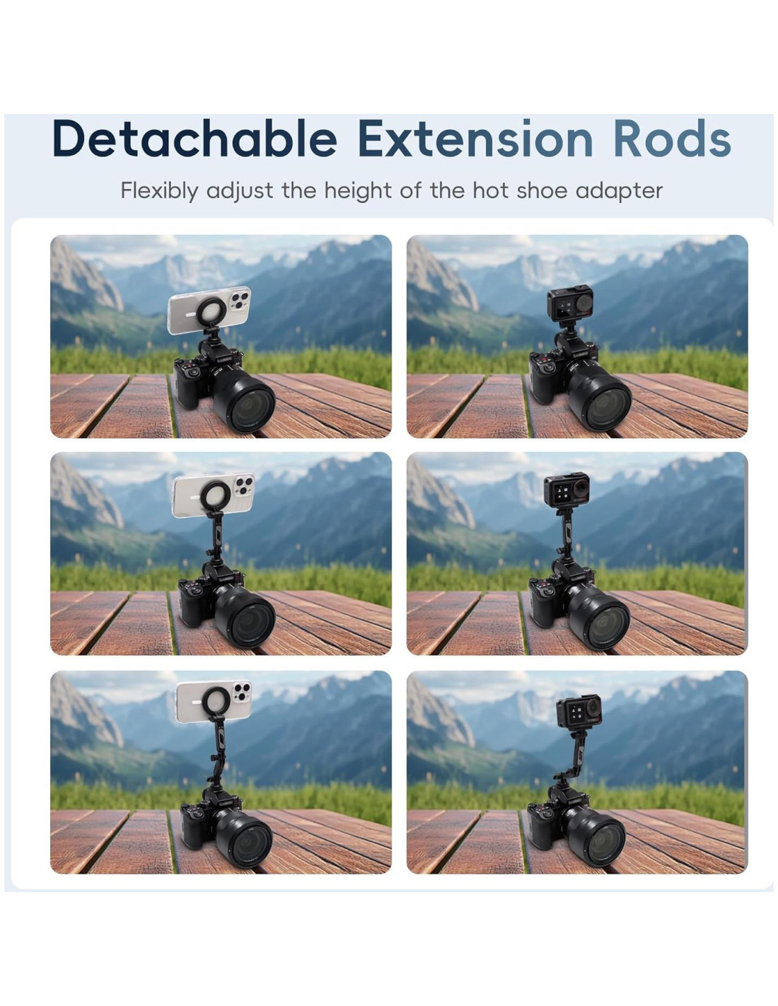 - Varilla de Extensión Desmontable: el soporte de zapata fría está compuesto por tres etapas de postes, la altura se puede ajustar al quitar la barra de extensión. Y las perillas de bloqueo pueden ajustar flexiblemente el ángulo de inclinación del soporte para teléfono de zapata caliente. La montura de trípode también se puede plegar para almacenamiento y es fácil de llevar. Es muy adecuada para viajes, eventos o creación de contenido en movimiento. Satisface fácilmente tus necesidades de grabación y proporciona flexibilidad y conveniencia.