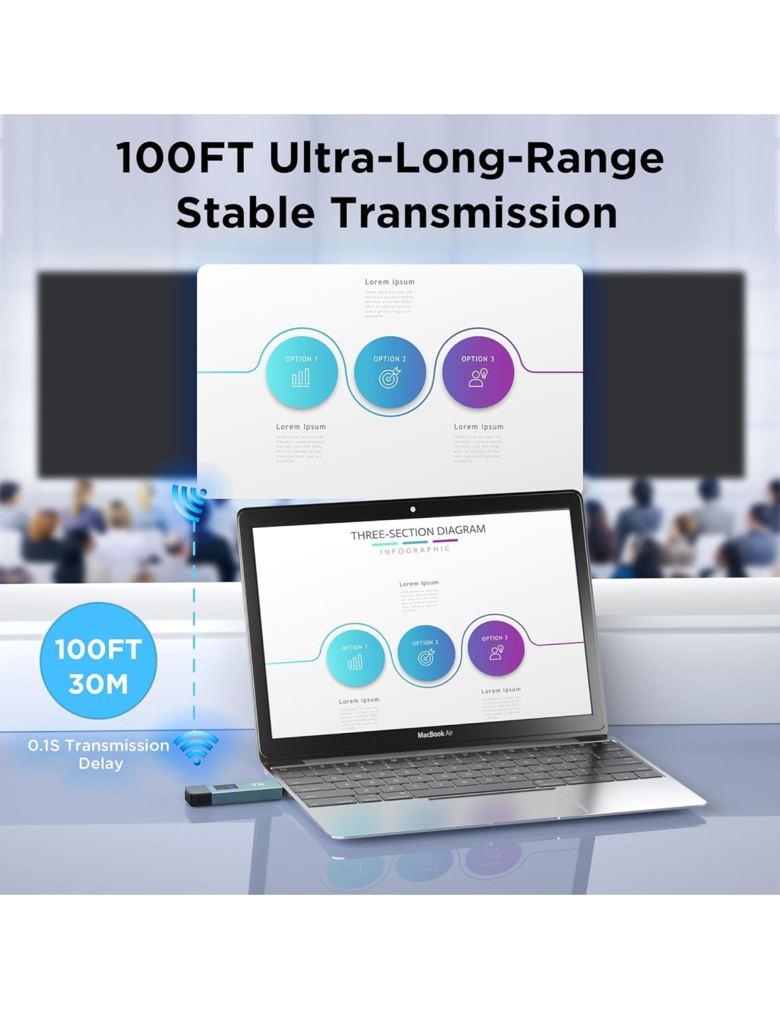 - Transmisión a larga distancia, conexión estable: Con transmisión de doble frecuencia 2.4G/5G, disfrute de conectividad estable hasta 30 metros de distancia. Ya sea para reuniones o ocio, experimente libertad audiovisual ininterrumpida