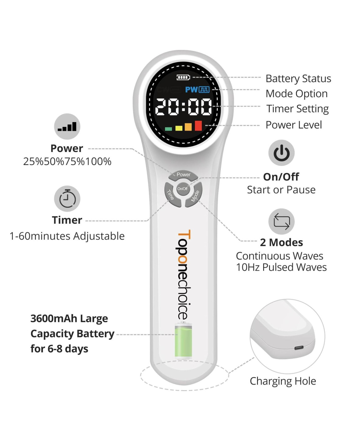 Si estás buscando una manera de aliviar tu dolor, considera el dispositivo de terapia de luz roja Toponechoice. Con su aplicación no invasiva y flexible, hace posible el uso autoadministrado en casa. Ayudando a las personas y mascotas a vivir una vida cómoda y feliz, lejos de altos costos. Por eso existe Toponechoice. 1, 660nm es visible cuando está en funcionamiento. 2, 810nm: cuando usas gafas, puedes ver un punto rojo cuando está en funcionamiento. 3, 980nm es invisible, no puedes ver ninguna luz roja cuando está en funcionamiento. 4 diodos*980nm Luz Roja Infrarroja Cercana promueven el alivio del dolor, la circulación y la relajación muscular; 4pcs*810 Infrarrojo Cercano Mejora la circulación sanguínea, acelera la recuperación del ejercicio y lesiones. 16pcs*660nm Luz Roja llega profundamente a la piel para aliviar el dolor en articulaciones y músculos. Alivio del Dolor Corporal. Alivia el Dolor de Hombro. Terapia de Luz para Perros. Terapia de Luz para Caballos. Pantalla LED de gran color; La onda pulsada (PW) es superior a la onda continua (CW) para la mayoría de las aplicaciones; 24pcs profesional y avanzada 4x980nm+4x810nm+16x660nm; Fácil operación y multifuncional con temporizador. Este dispositivo de terapia de luz roja portátil es ligero y compacto, con tiempo de espera y uso prolongado, puedes usarlo en cualquier lugar y en cualquier momento, ya sea en la oficina, en casa o en viajes al aire libre.