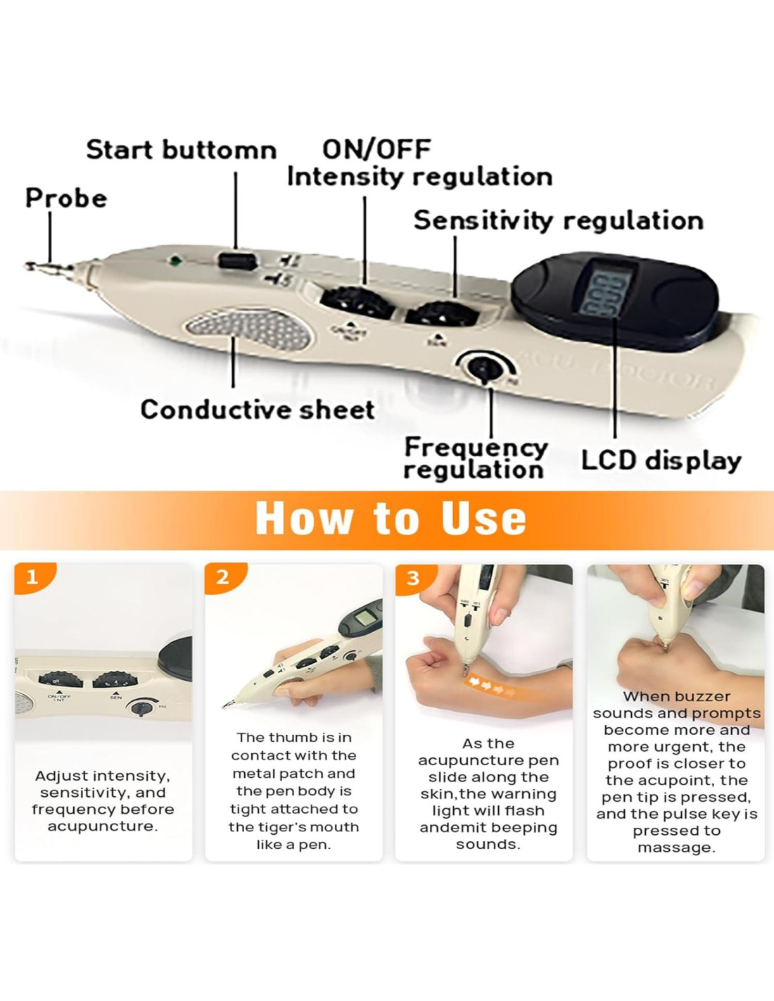 - No Necesita Agujas y Fácil de Usar: El Bolígrafo de Acupuntura Electrónica GGFSSQ simplemente presiona las herramientas de masaje en el área afectada, y liberará un pulso adecuado a los meridianos y puntos de acupuntura, mejorando la circulación sanguínea y aliviando el dolor. No se necesitan agujas, por lo que no solo es indoloro, sino que la piel nunca se perfora, haciéndolo seguro para usar en casa. Viene con un manual de usuario que tiene varios gráficos sobre los puntos de acupuntura terapéuticos del cuerpo que muestran dónde usar el bolígrafo de masaje.