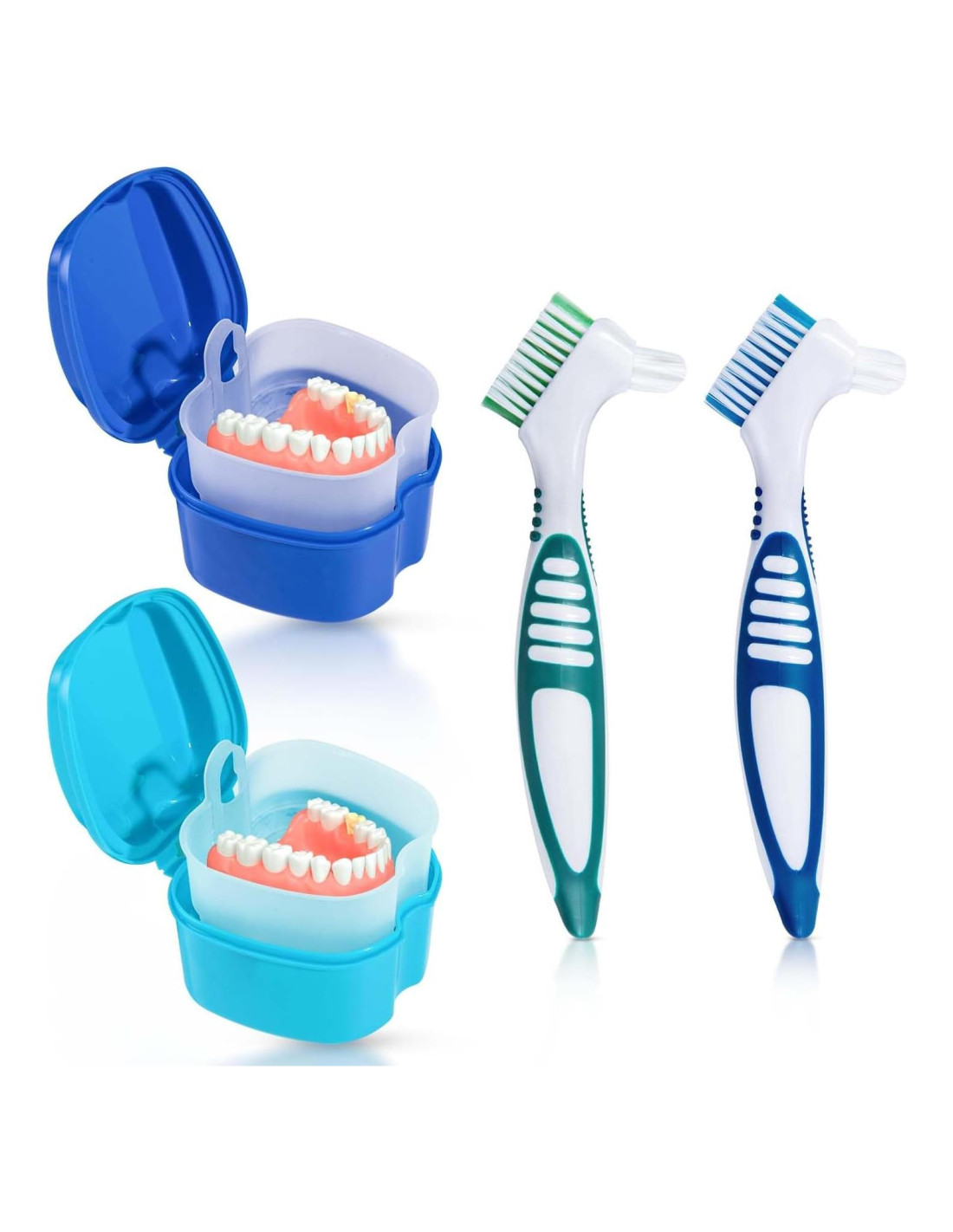 Descripción de la Marca: Garantizamos que nuestros productos son no tóxicos, saludables y amigables con el medio ambiente. Prometemos brindarte el mejor servicio. Especificaciones: - Tamaño: 9.6 x 9.6 x 6.8 cm, tamaño del cepillo es 16 cm. - Color: Azul, Verde. Paquete Incluido: - 2 paquete estuche de baño para dentaduras y 2 paquete cepillo para dentaduras.