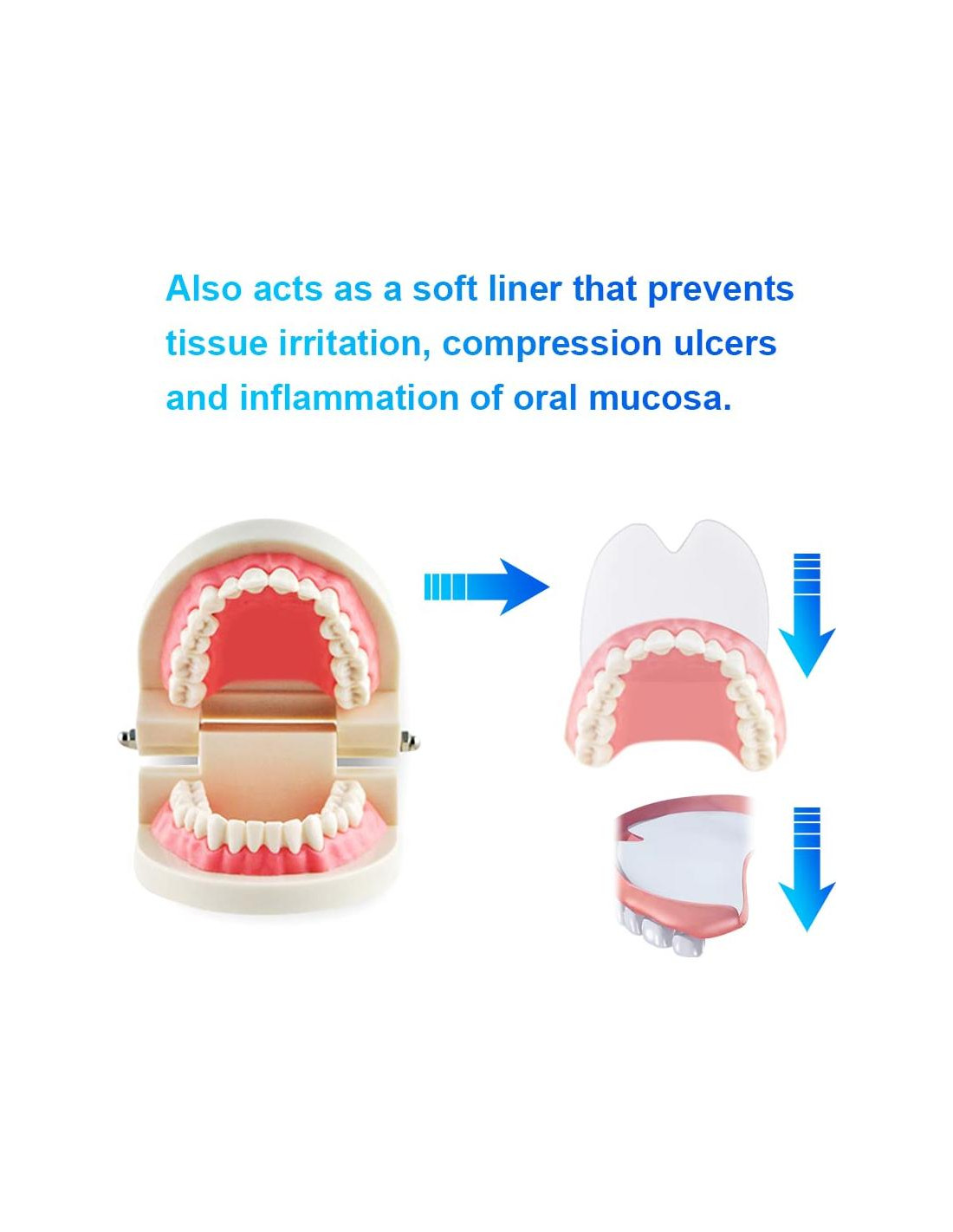 - [Consejos] También actúa como un forro suave que alivia la sensibilidad y previene la irritación del tejido. Puede cortar tiras a un tamaño cómodo, teniendo en cuenta dejar un margen de dentadura de 2mm.