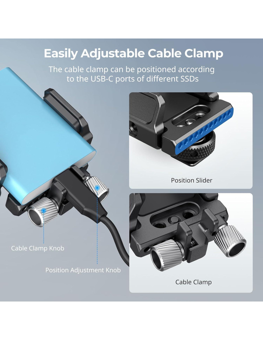 - [INCLUYE ABRAZADERA PARA CABLE USB-C] Viene con una abrazadera para fijar el cable USB-C, asegurado por un tornillo de perilla. Este soporte para SSD es compacto y versátil para fotógrafos y videógrafos