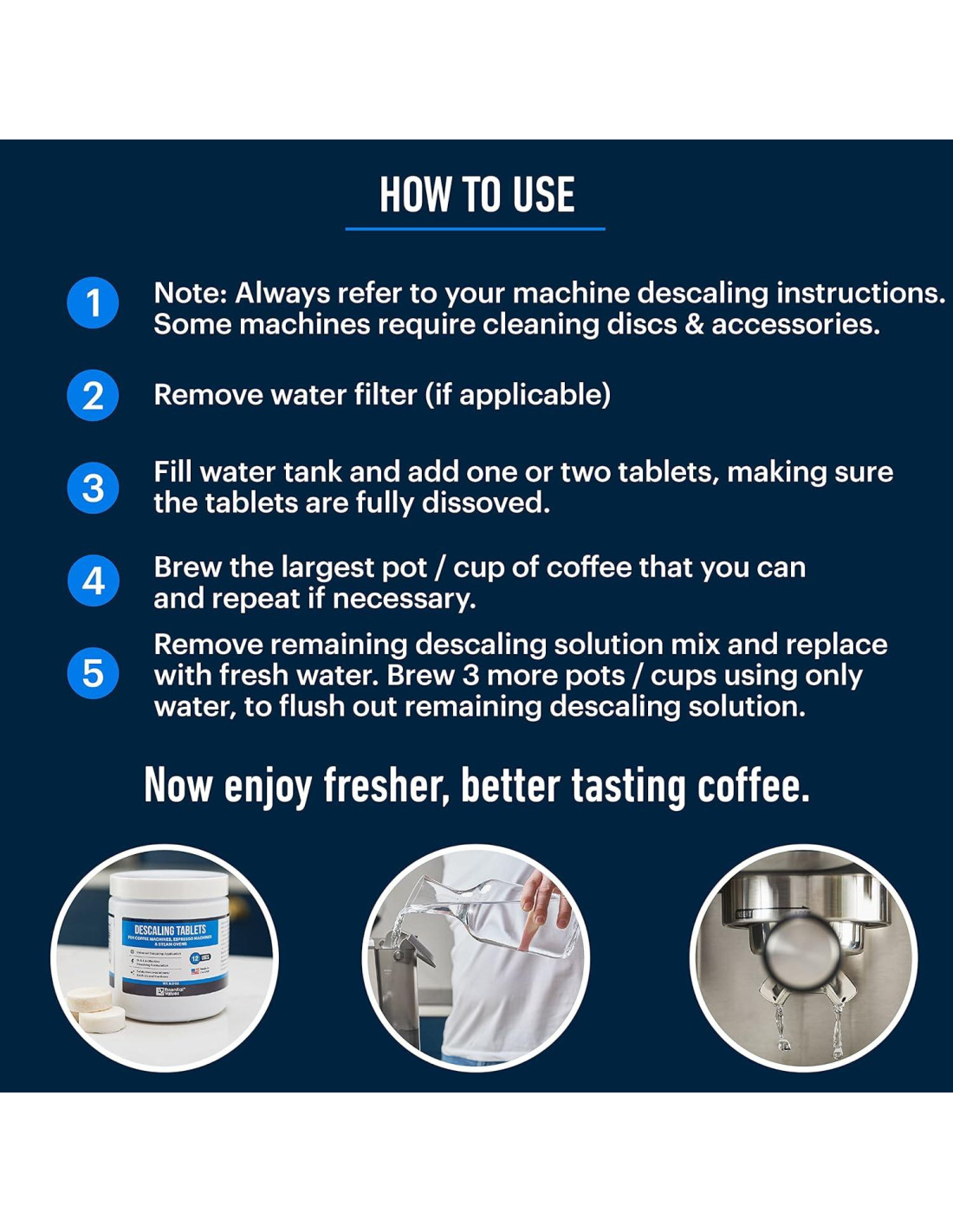 - Tabletas de Limpieza de Café - Elimine la acumulación de sarro y calcio con las tabletas desincrustantes Valores Esenciales. Elimina eficazmente la acumulación de máquinas de café y hornos de vapor para mejorar la función y el rendimiento.