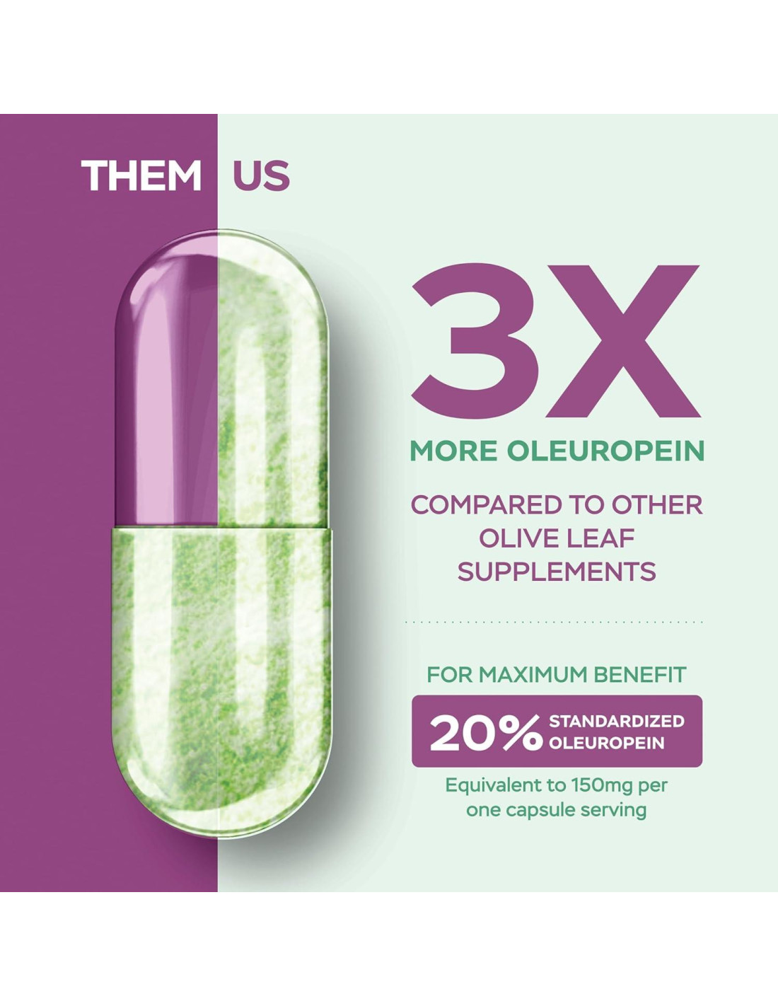 - Oleuropeína de Triple Fuerza - Las hojas de olivo son ricas en Oleuropeína, que es responsable de los beneficios de la planta. Hemos estandarizado nuestra formulación para que cada cápsula entregue 20% Oleuropeína equivalente a 150mg. Eso es 3 veces más que los suplementos que ofrecen un rendimiento de 50mg. Una de nuestras cápsulas contiene la misma cantidad de polifenoles presentes en más de 0.25 litros de aceite de oliva, lo que la convierte en un suplemento increíblemente potente. Obtén los increíbles beneficios por ti mismo sin las calorías.
