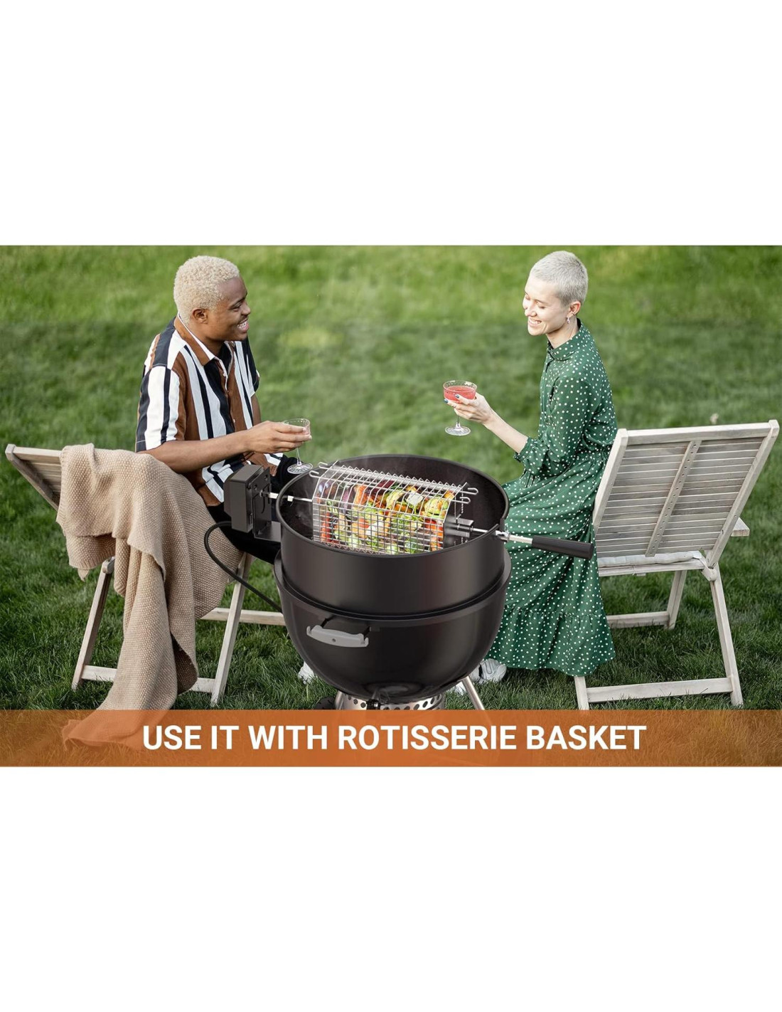 - [Incluye paquete] Incluye anillo de acero recubierto negro resistente a altas temperaturas, 1 varilla cuadrada estándar de 5/16" (0,79 cm), 1 motor eléctrico de 110V, 2 tenedores de carne de cuatro puntas y 1 mango. ¡Mide el tamaño de tu parrilla antes de ordenar!