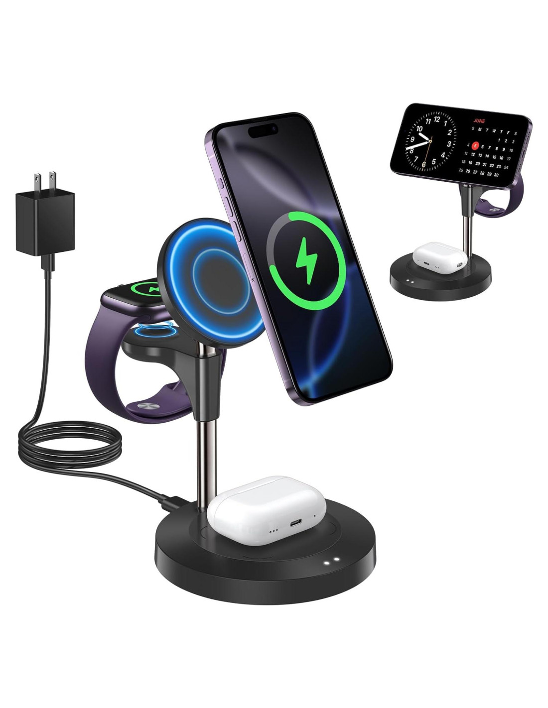 - Ángulo de Visualización Ajustable - Permite que el cargador magsafe de iphone se incline hasta 40 hacia arriba y hacia abajo y que el iphone se coloque horizontal o verticalmente, dándote la flexibilidad para posicionar tu iphone para la mejor experiencia visual. La estación de carga 3 en 1 de Aeinidi para Apple no solo es un cargador Mag-Safe, sino también un conveniente soporte para iphone para mantener tu dispositivo al alcance.