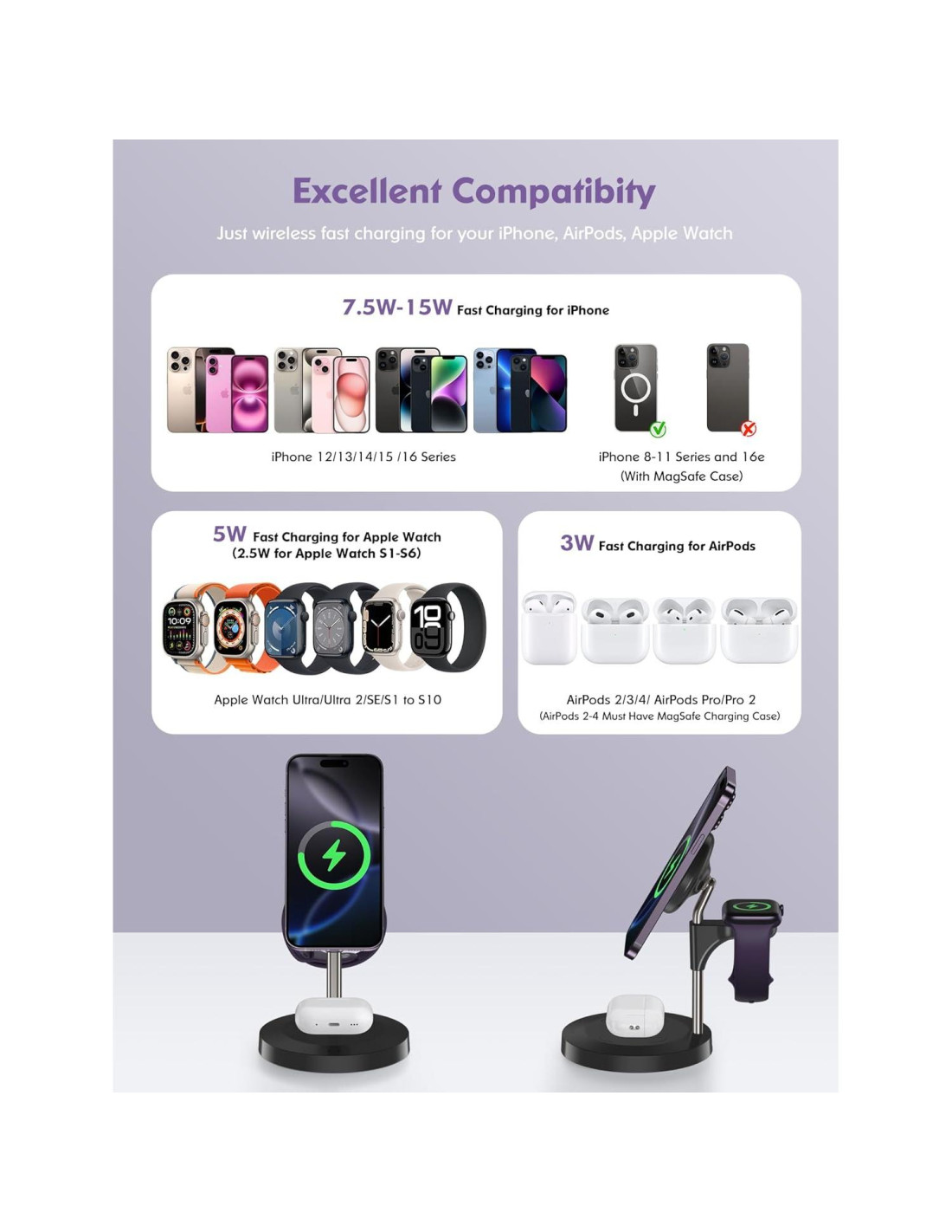 - Múltiples Protección de Seguridad - Pasó pruebas rigurosas y recibió certificaciones FCC y CE, el soporte de cargador Mag-Safe de Aeinidi mejoró la protección contra sobrecorriente, sobrevoltaje y sobrecalentamiento, así como la detección de objetos extraños (la luz indicadora parpadeará en caso de un estado anormal). ¡Carga tus dispositivos con confianza con esta estación de carga 3 en 1 de alta calidad y segura para Apple!