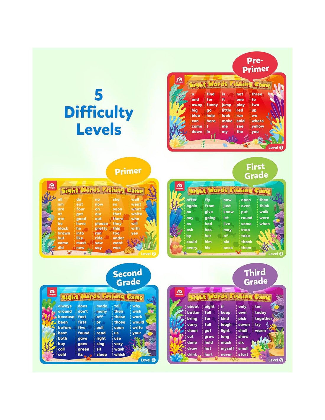 - Codificado por Color con Cinco Niveles: Cada nivel de palabra de vista es de un color diferente y tiene una forma de pez diversa. Con rojo para el nivel pre-k, amarillo para el nivel de jardín de infantes, verde para el primer grado, azul para el segundo grado y púrpura para el tercer grado. La lista de palabras de vista también está dividida en cinco tarjetas de palabras y coordinada por color con cada nivel.