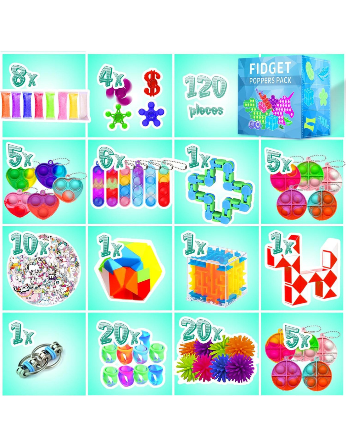 - PACK DE 120: 4 Burbujeas Pop, 1 Cadena Giratoria, 6 Mochis Squishies, 6 Juguetes de Cuerda Elástica, 4 Juguetes Sensoriales de Malla y Canica, 1 Almohadilla Antiestrés, 1 Cubo de Serpiente, 1 Juguete de Pistas, 1 Cubo Infinito, 1 Pelota de Fútbol, 2 Cajas de Rompecabezas, 1 Soya de Estrés, 2 Pulseras Pop, 21 Anillos Pop, 21 Mini Burbujeas Pop, 1 Pelota Pop, 10 Calcomanías, 20 Pelotas Espinosas, 8 Masilla Espuma, 5 Tubos Pop y 3 Spinners Antiestrés