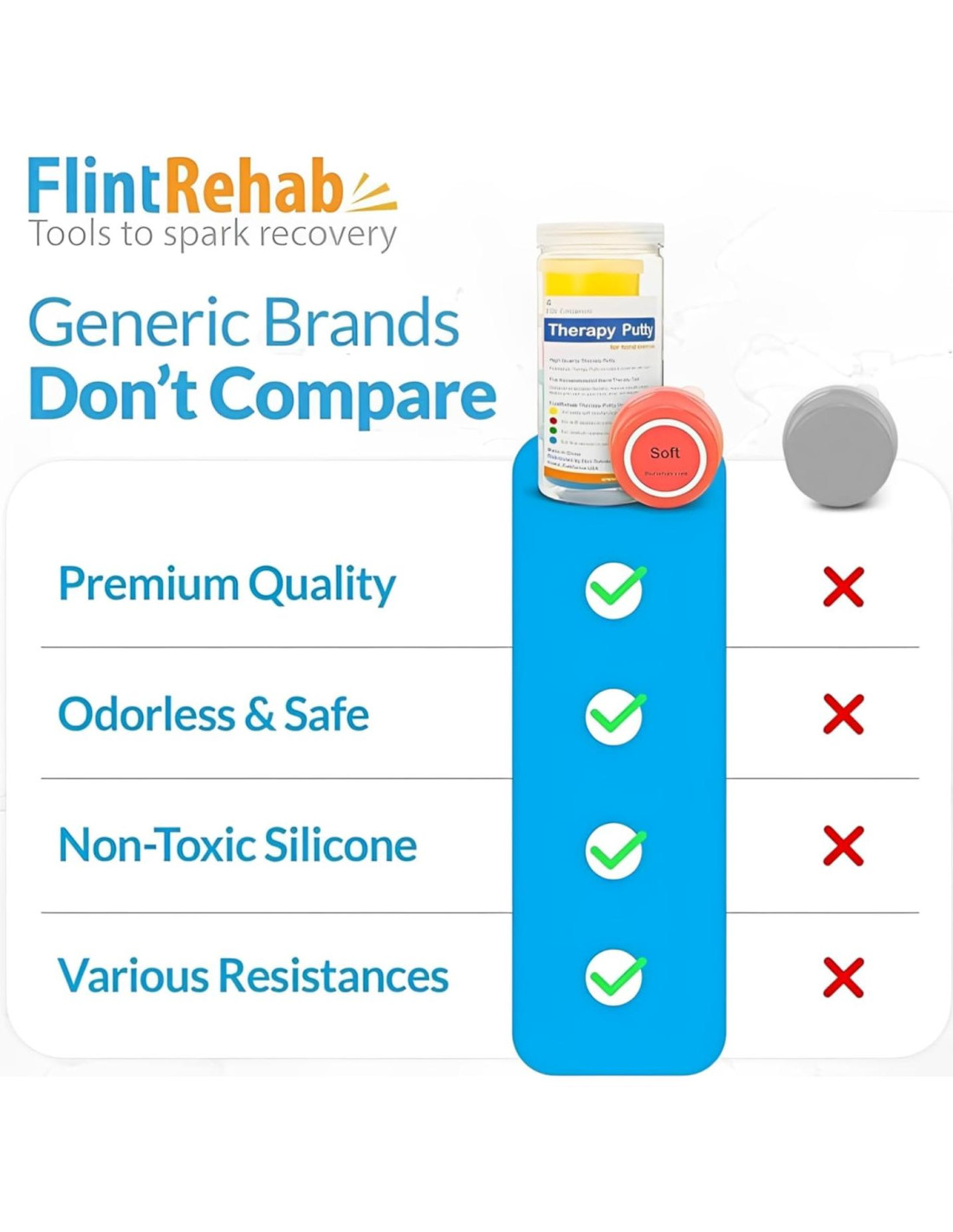La pasta de terapia FlintRehab contiene cuatro pastas de resistencia variable para la rehabilitación de manos. Cada envase de pasta incluye tres (3) onzas (85 g) de pasta que es a base de silicona, no tóxica y sin fragancia.