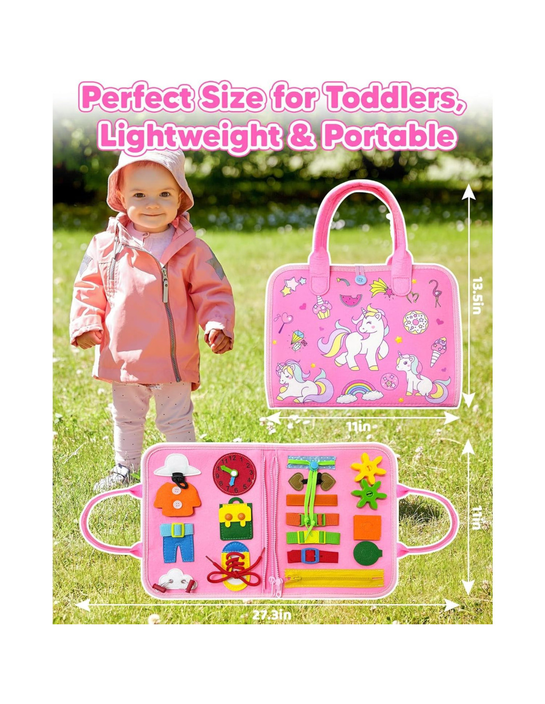 - 8 páginas en 1 Tablero Ocupado: Este libro ocupado de Unicornio Rosa tiene 8 páginas de actividades y contiene 24 actividades de aprendizaje en habilidades básicas de vestir, letras, números, formas, colores, emparejamiento de animales y un juego de rompecabezas temático de unicornios, manteniendo a tus pequeños comprometidos durante mucho tiempo.