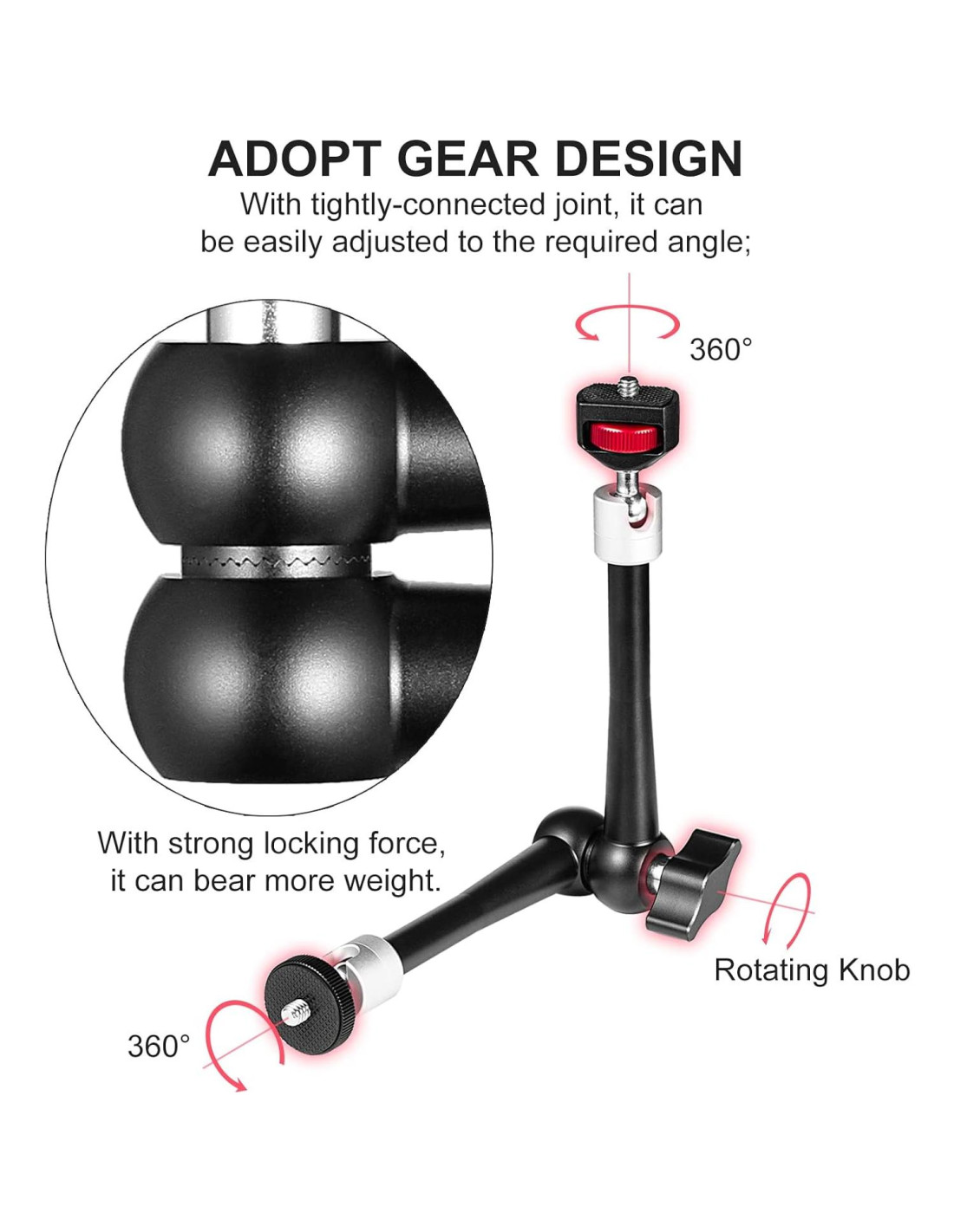 - Pequeño y Ligero: El brazo mágico de 11'' (con adaptador de zapato frío) y la super abrazadera son livianos y se pueden deslizar fácilmente en un bolsillo para actividades en interiores y exteriores; La capacidad de carga máxima de la super abrazadera es de 4.4 lb (2 kg)