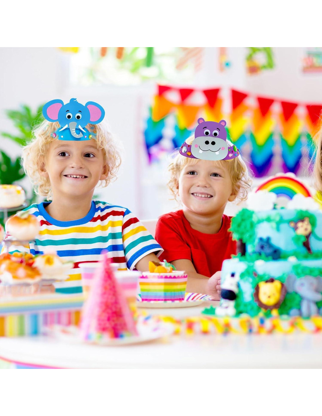 - Componentes incluidos: 24 Kits de Manualidades de Diademas de Animales de la Selva, 24 bases de diademas de cartulina, 48 tiras ajustables, 24 bases de espuma en 6 formas de animales de la selva, 24 juegos de pegatinas de cara de papel, 24 juegos de pegatinas de características de animales de espuma, 48 ojos móviles, 2 hojas de pegatinas de joyas, 24 bolsas de regalo, 24 lazos de torsión, 24 etiquetas de regalo, 2 guías
