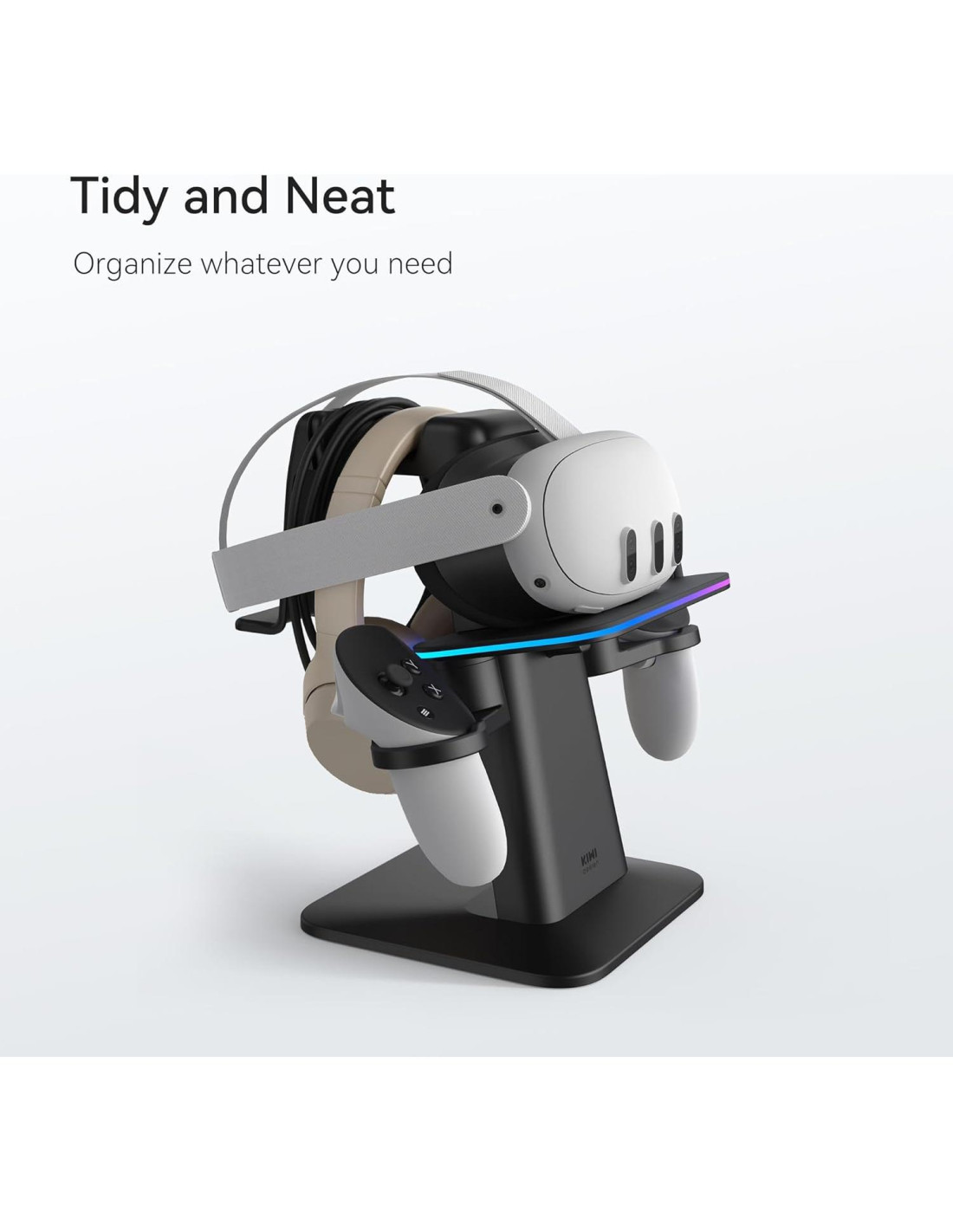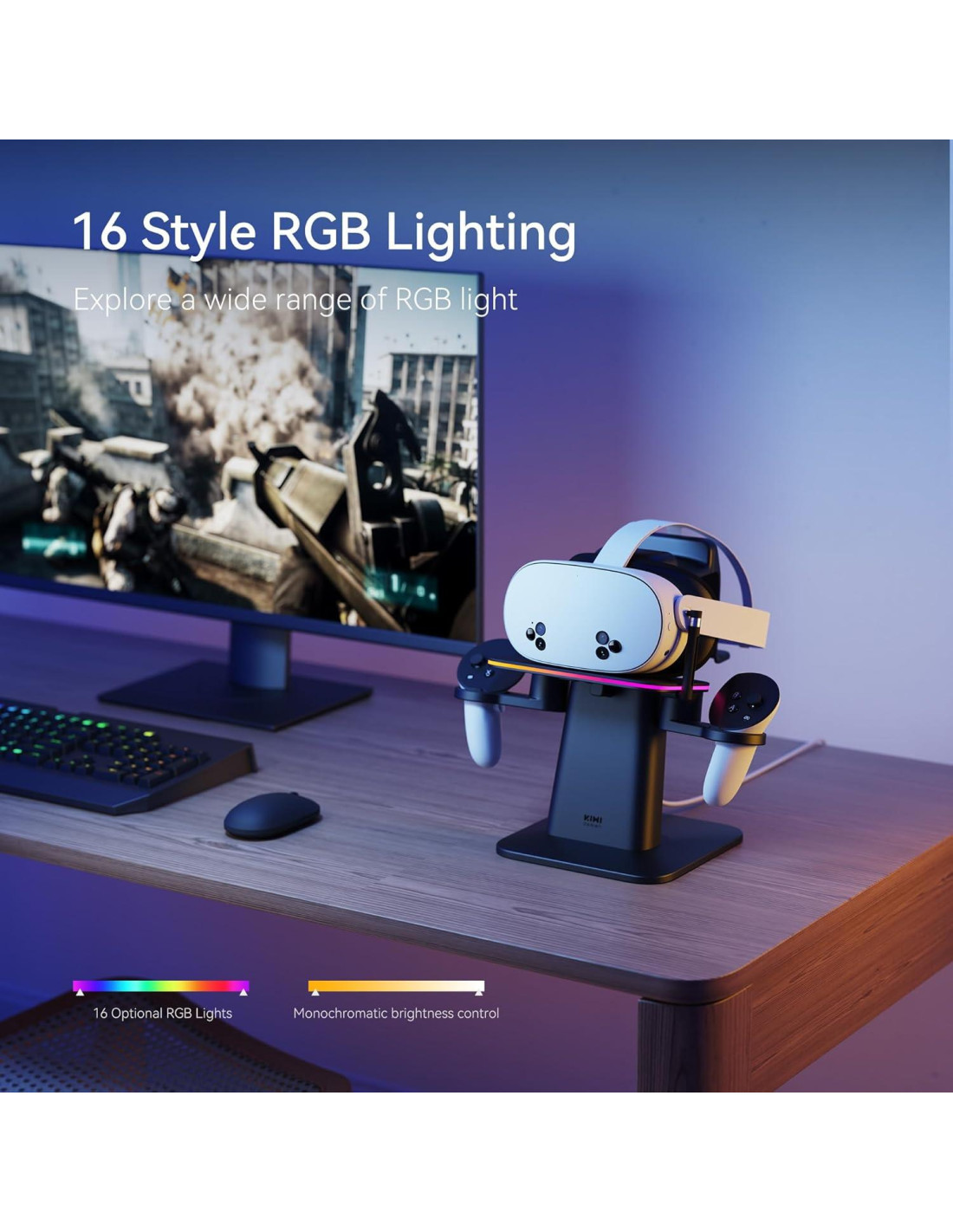 - Compatibilidad Perfecta: El cable de carga magnético flexible, junto con la superficie libre de rayones en la plataforma RGB y los soportes, se adapta fácilmente a varios auriculares y controladores