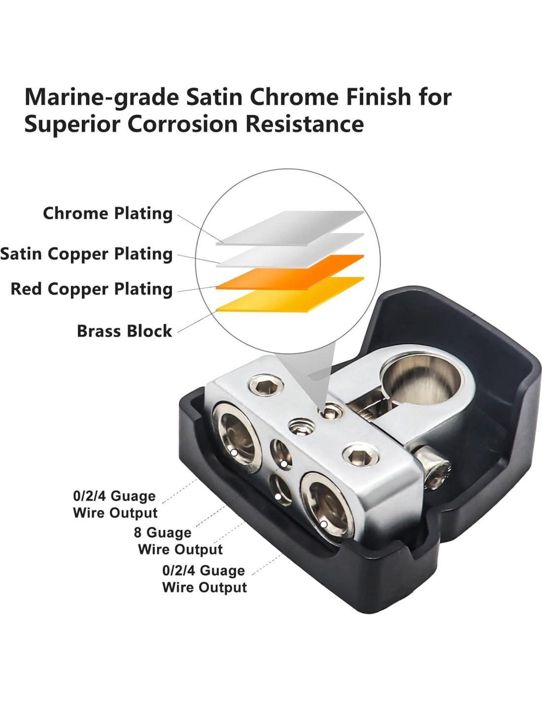 - Cada terminal de batería divide la conexión en cuatro salidas, dos salidas de 0/2/4 gauge y dos salidas de 8 gauge.