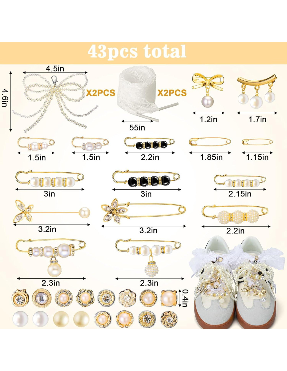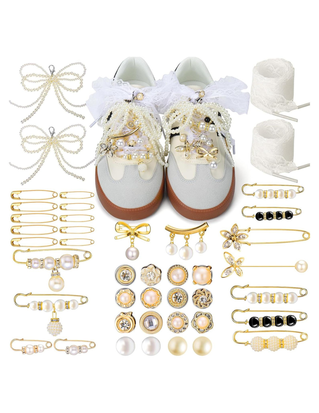 - Encantos de perlas para zapatos deportivos y calcetines: conjunto de 43 piezas de encantos de perlas para zapatos, cubriendo 40 diseños únicos, discretos y elegantes, personaliza fácilmente la lengüeta del zapato, los cordones y los calcetines, ya sea un lazo, insignia o pin de perla, puedes agregar mucha personalidad a tus zapatillas y calcetines.